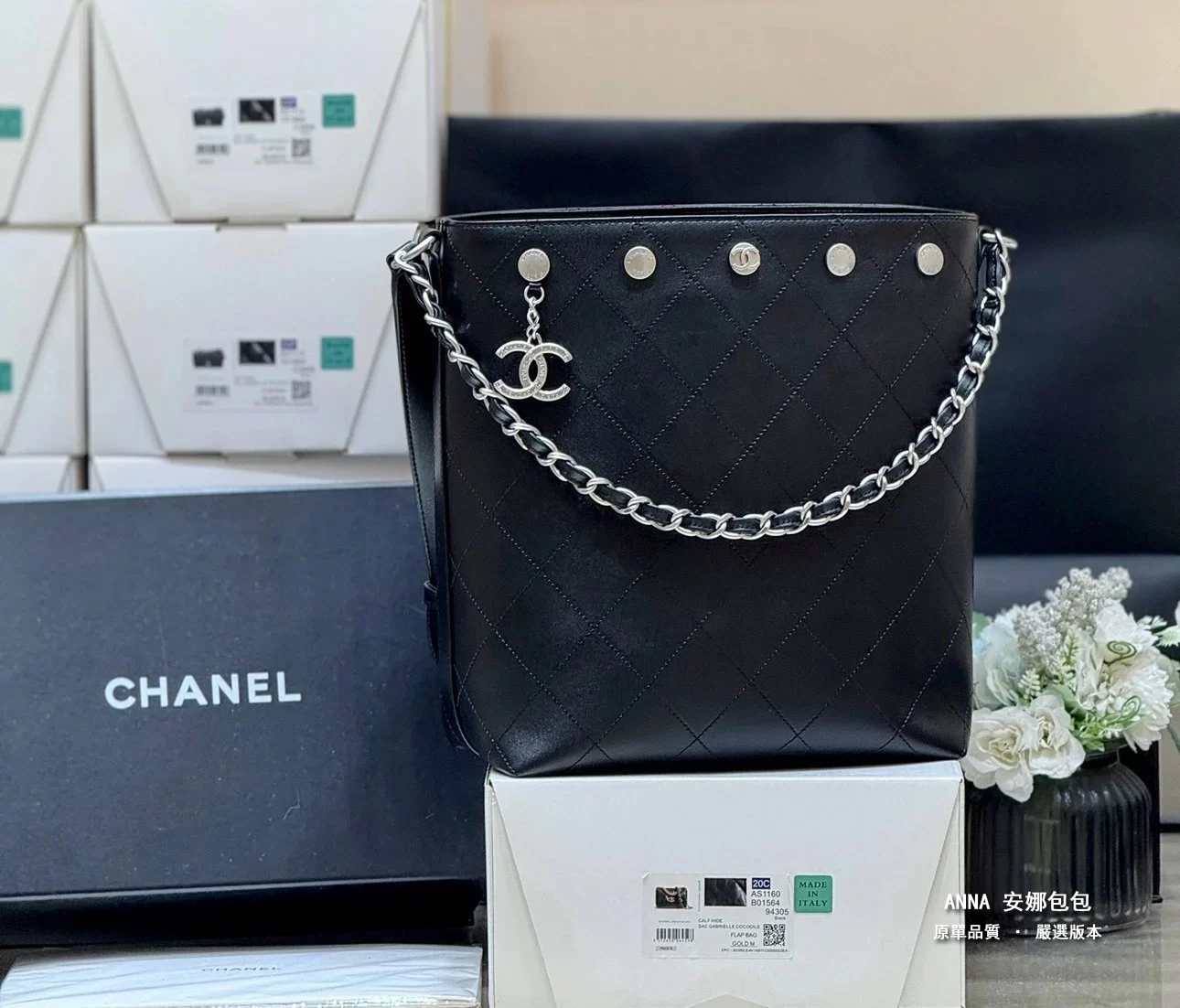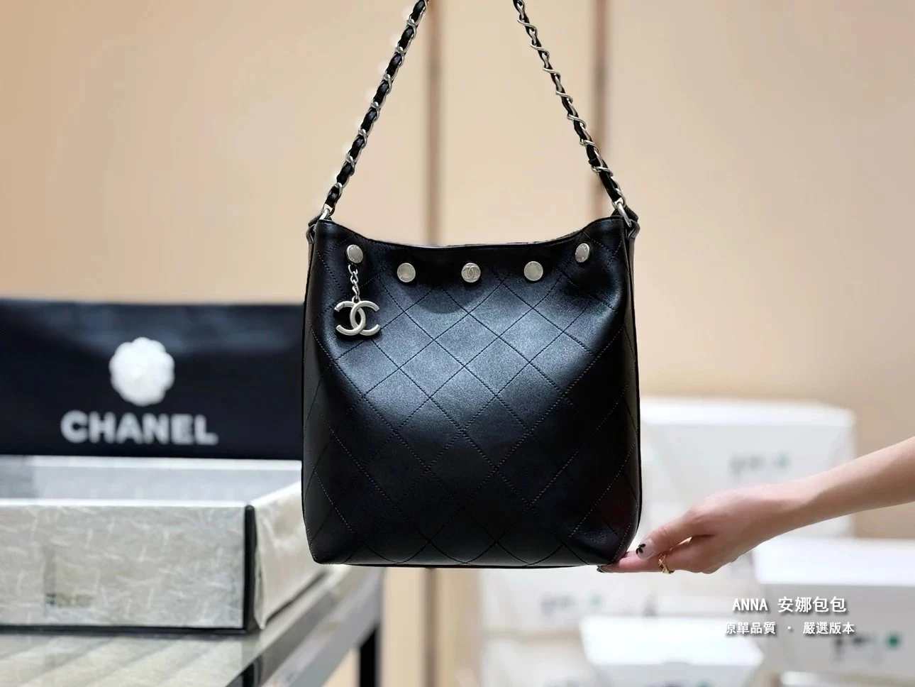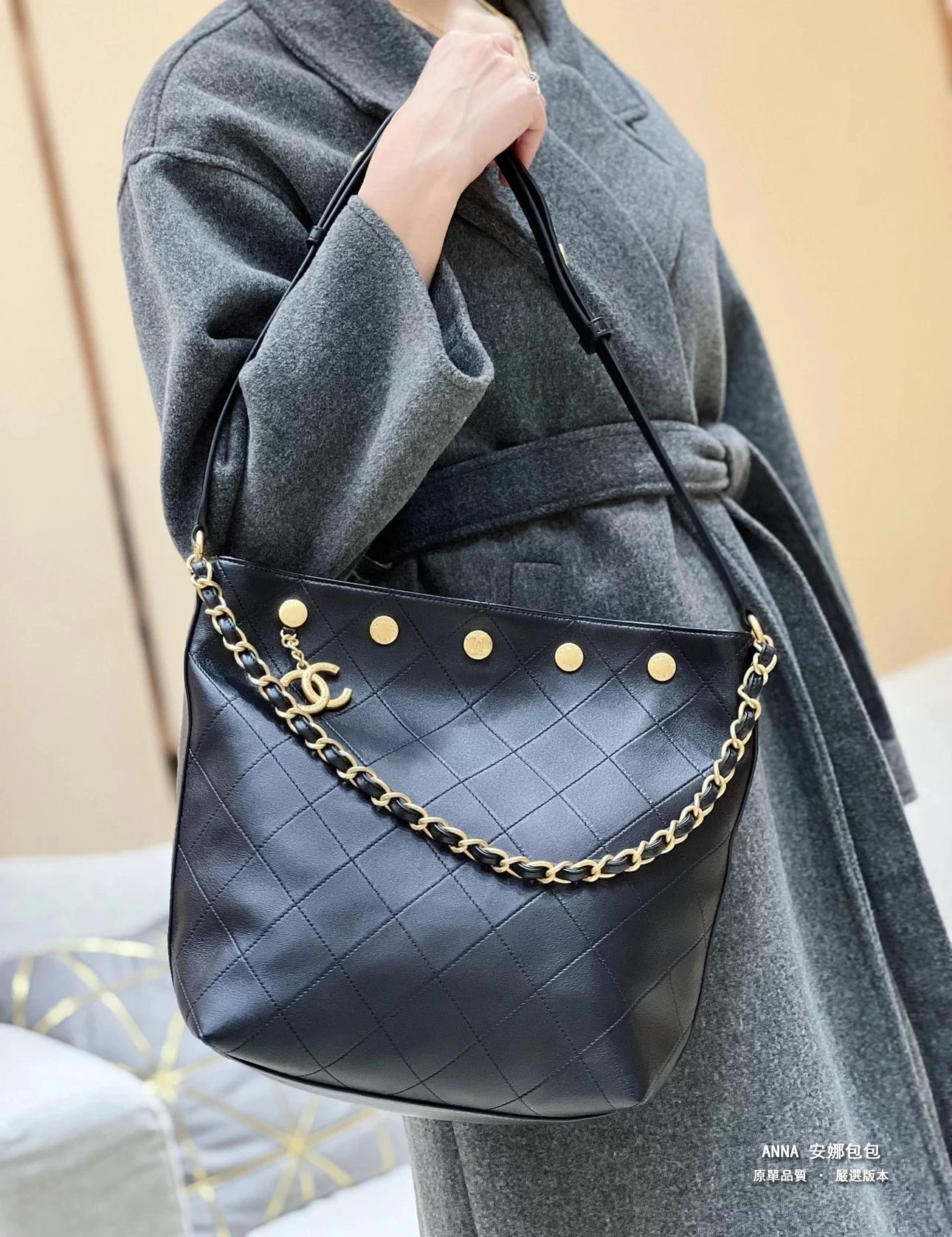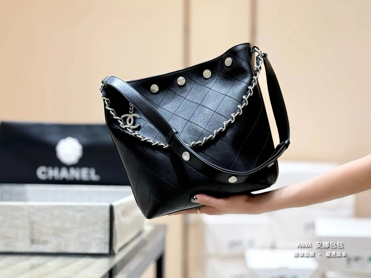 香奈兒 水桶包 鉚釘鏈條 菱格小羊皮 原廠皮復刻版本 28cm