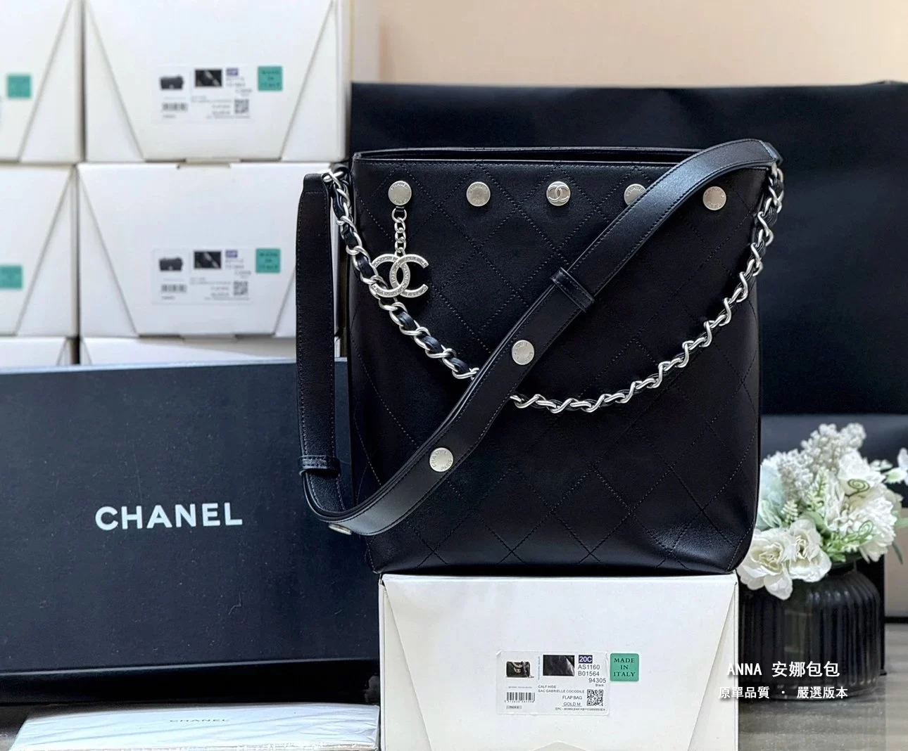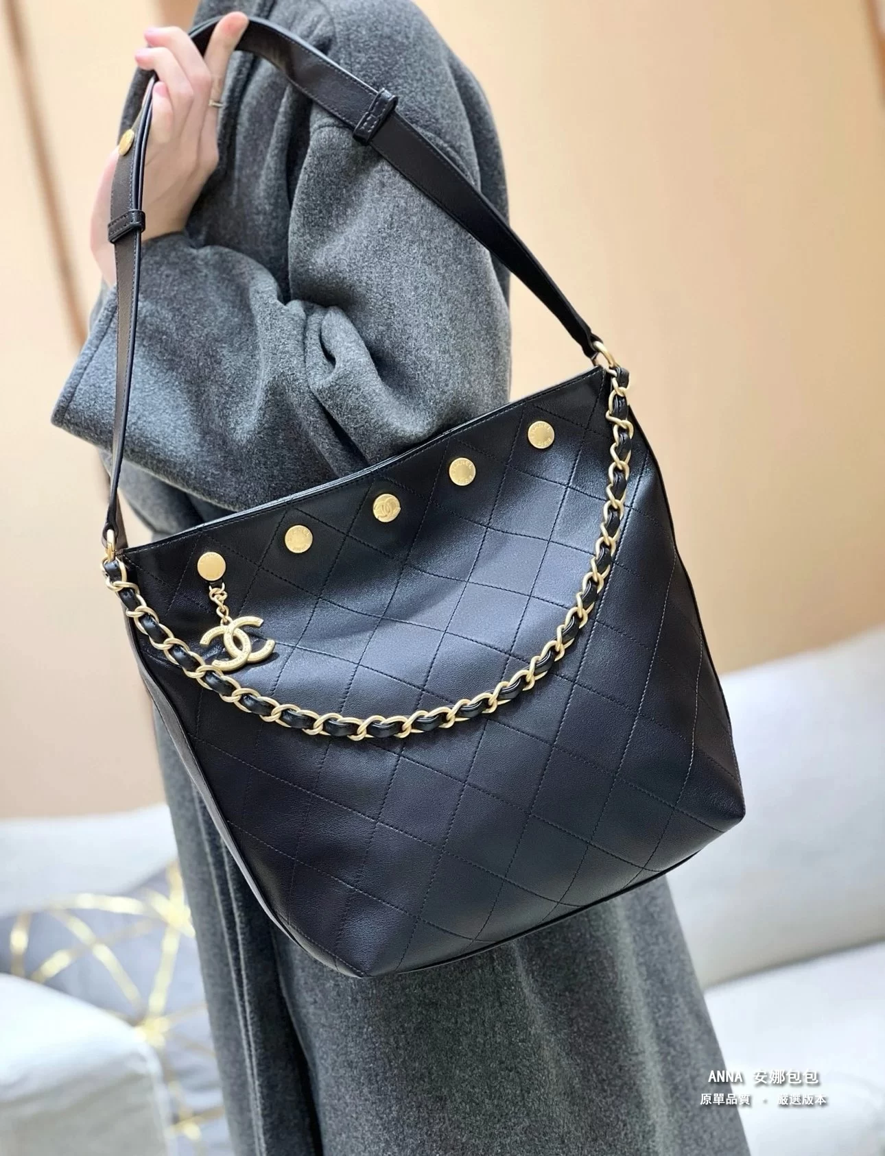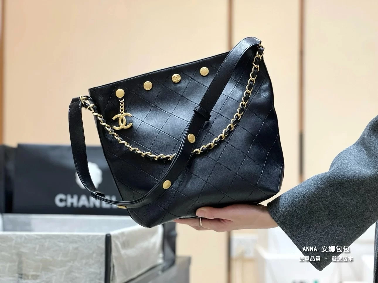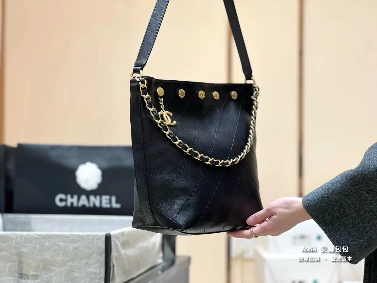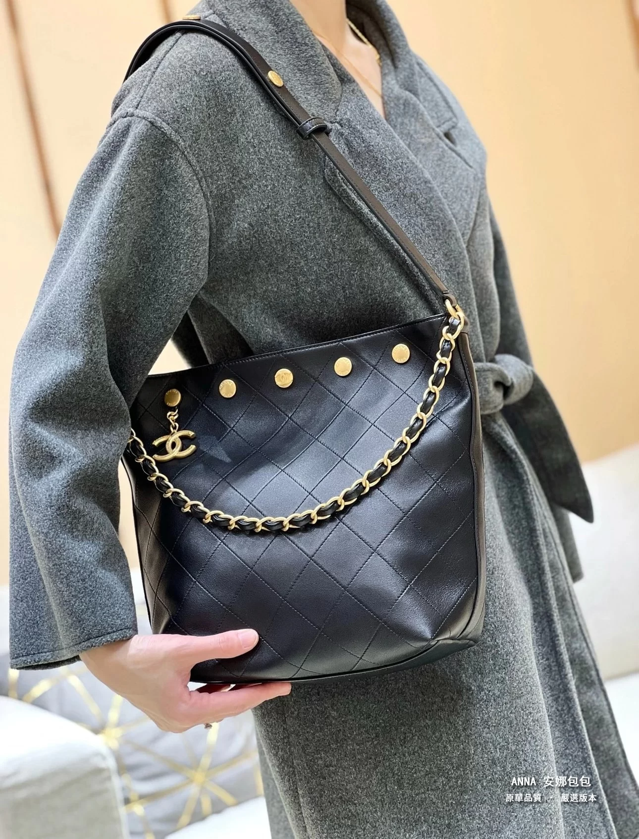 香奈兒 水桶包 鉚釘鏈條 菱格小羊皮 原廠皮復刻版本 28cm