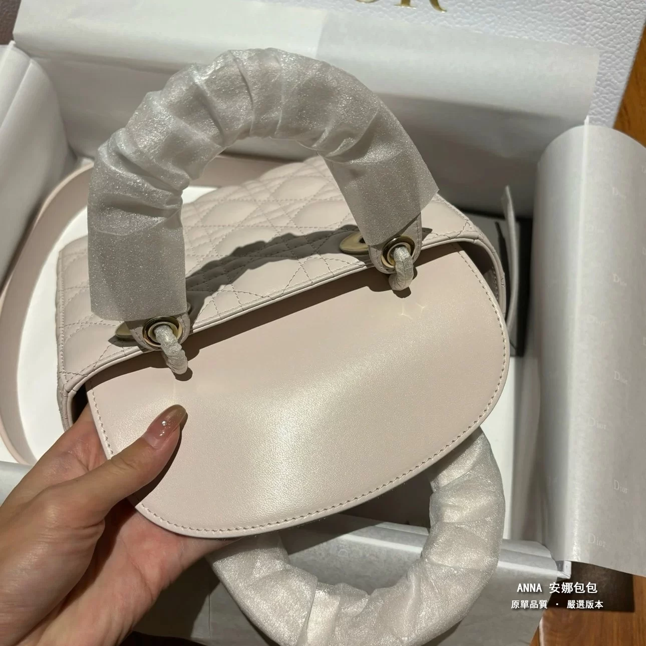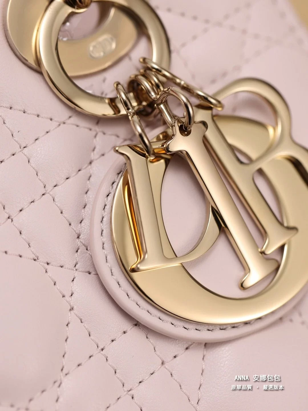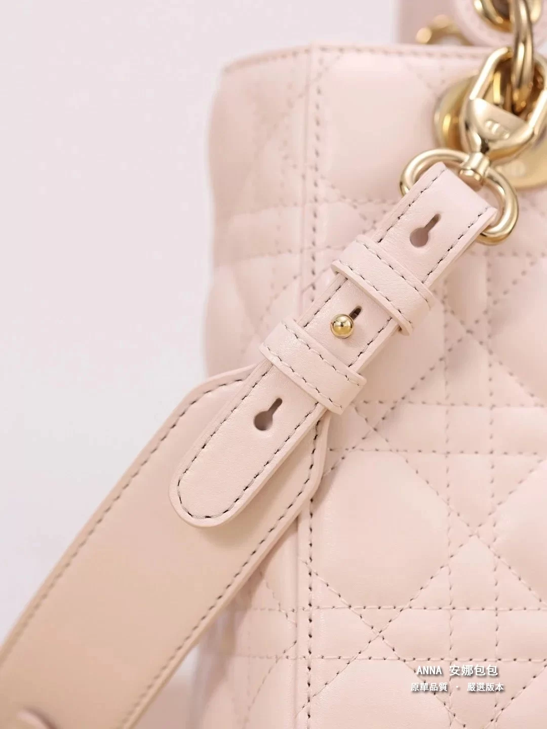 有淺金色飾面金屬 D..0.R.吊飾,彰顯優雅氣質。小號款式,設計別緻,肩帶可搭配經典徽章彰顯個性,可手提或斜挎。