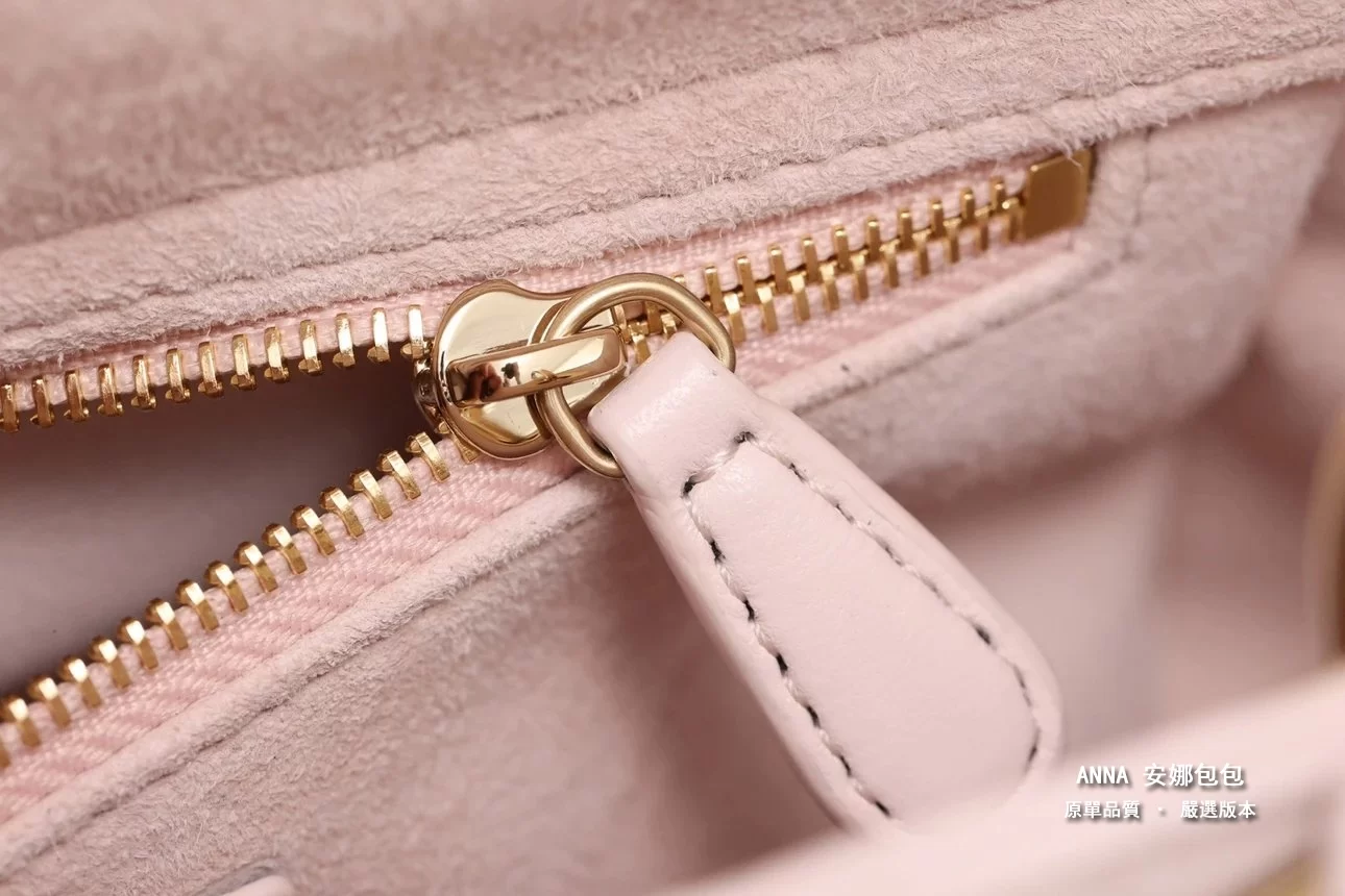採用櫻花粉羊皮革精心製作,以藤格紋絹面線打造醒目的絎縫紋理,時髦典雅的設計經久不衰。