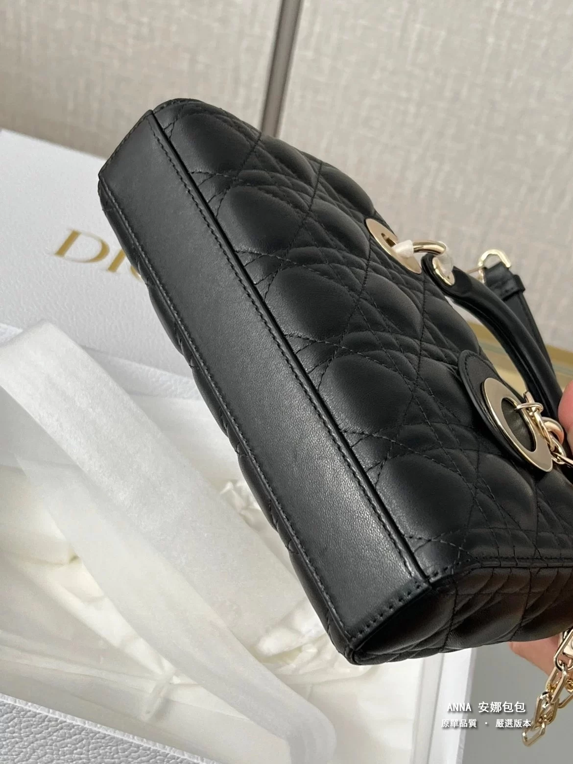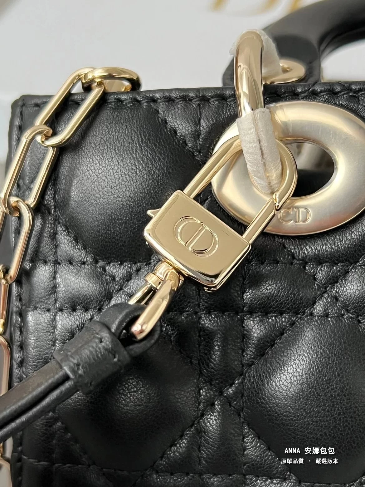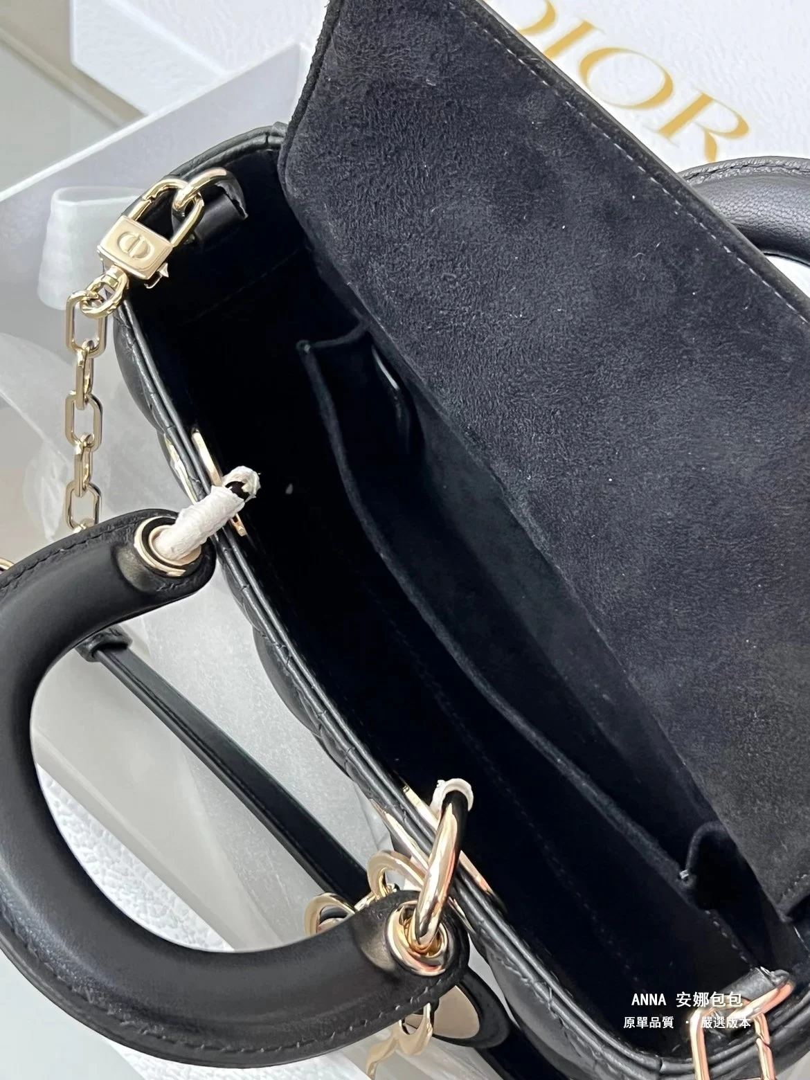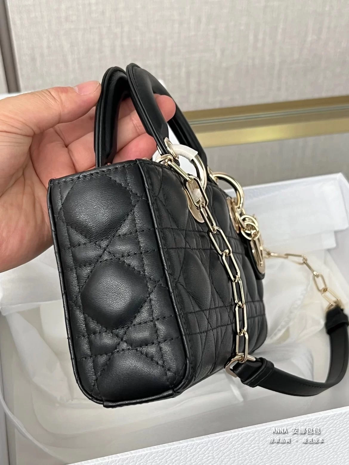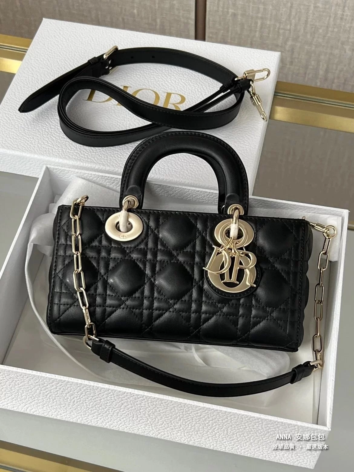 這款Lady D-Joy 手袋凸顯Lady Dior系列的簡約美學,集中體現了Dior對優雅和美麗的深刻洞見。採用黑色羊皮革精心製作,飾以藤格紋緝面線,搭配淺金色飾面金屬D.I.O. R.吊飾提升格調,爲精美的輪廓增添一分靈動。小號款式,搭配可拆卸的鏈條肩帶和可調節、可拆卸的皮革肩帶,可手提、肩背或斜挎,是日常造型的理想之選。