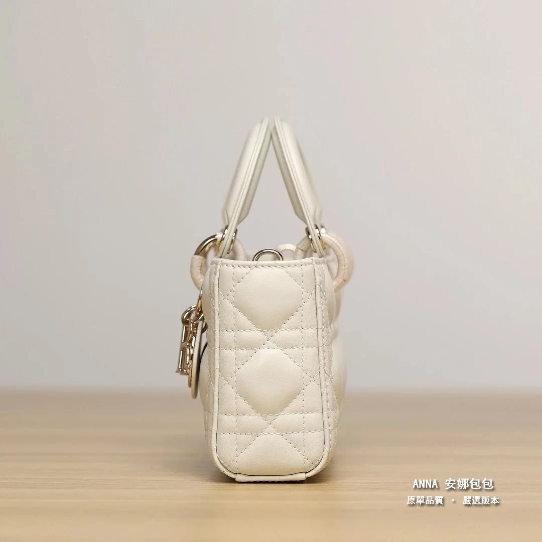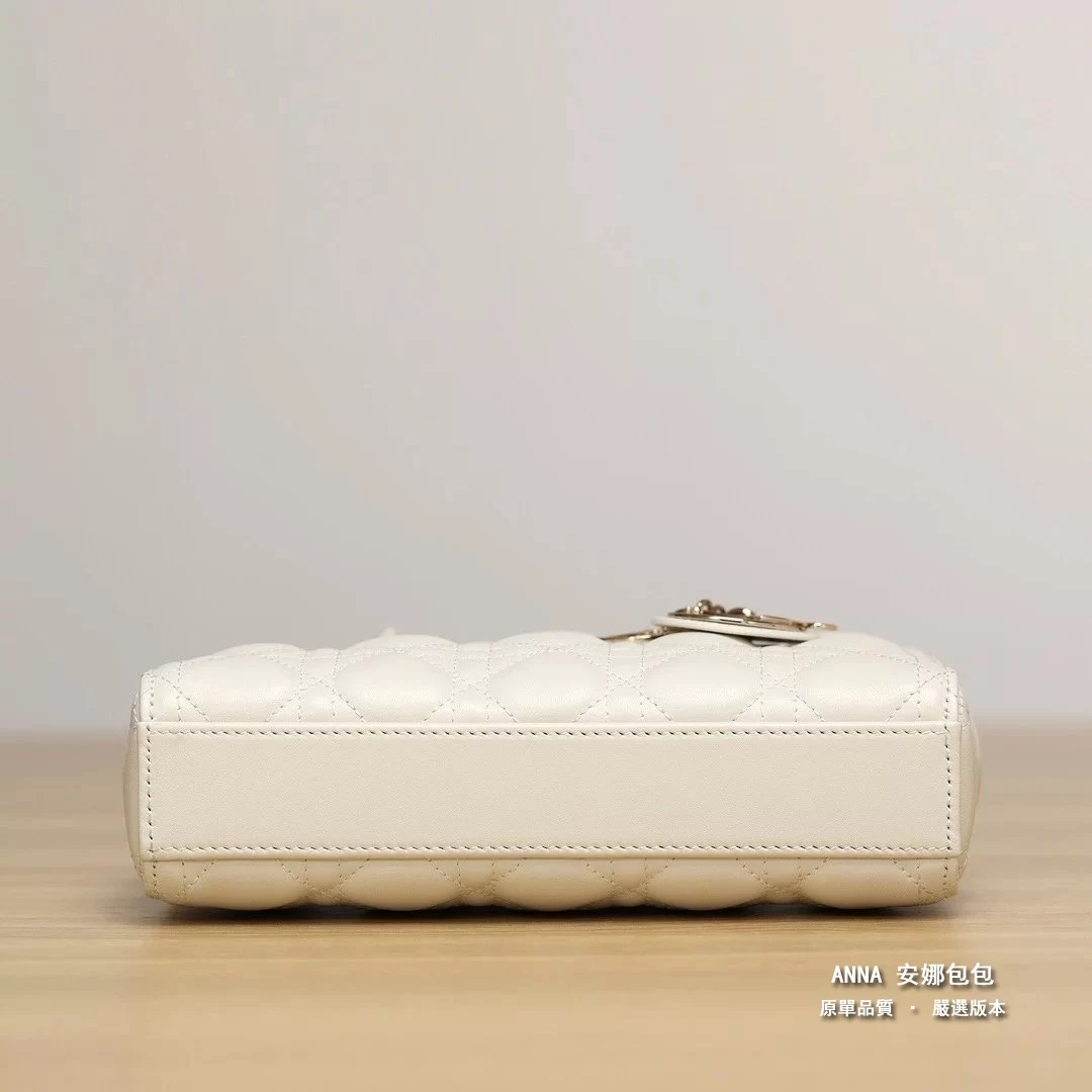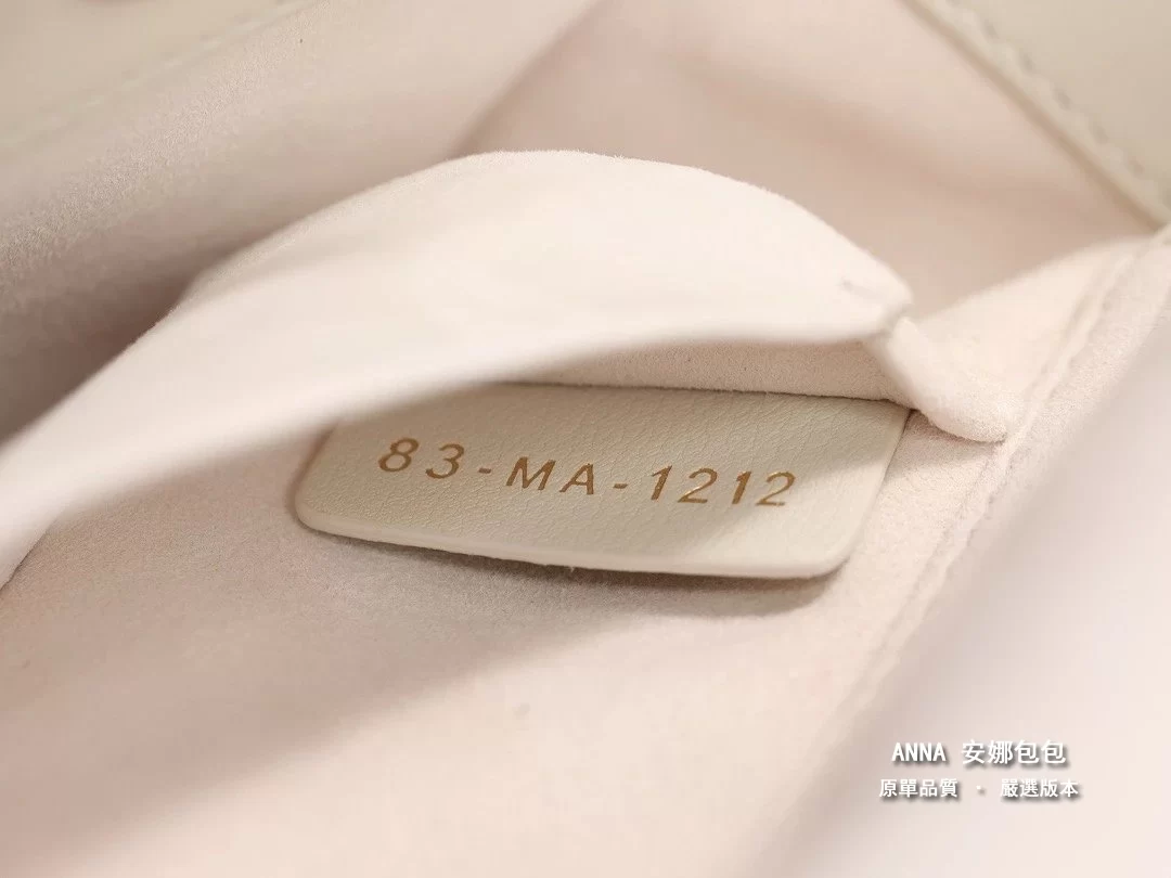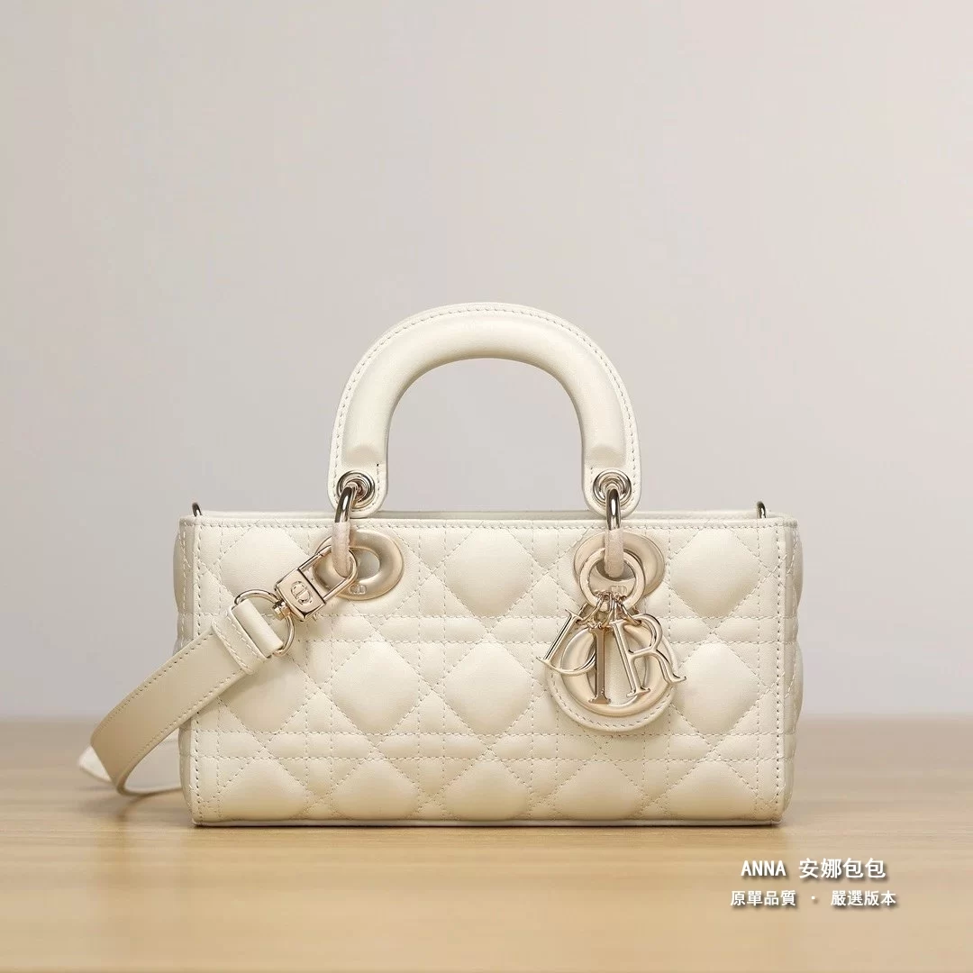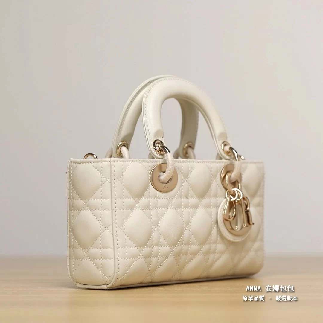 這款Lady D-Joy手袋凸顯Lady Dior系列的簡約美學,集中體現了Dior對優雅和美麗的深刻洞見。採用奶白色羊皮革精心製作,飾以藤格紋緝面線,搭配淺金色飾面金屬 D.I.O.R.吊飾提升格調,爲精美的輪廓增添一分靈動。小號款式,搭配可拆卸的鏈條肩帶和可調節、可拆卸的皮革肩帶,可手提、肩背或斜挎,是日常造型的理想之選。