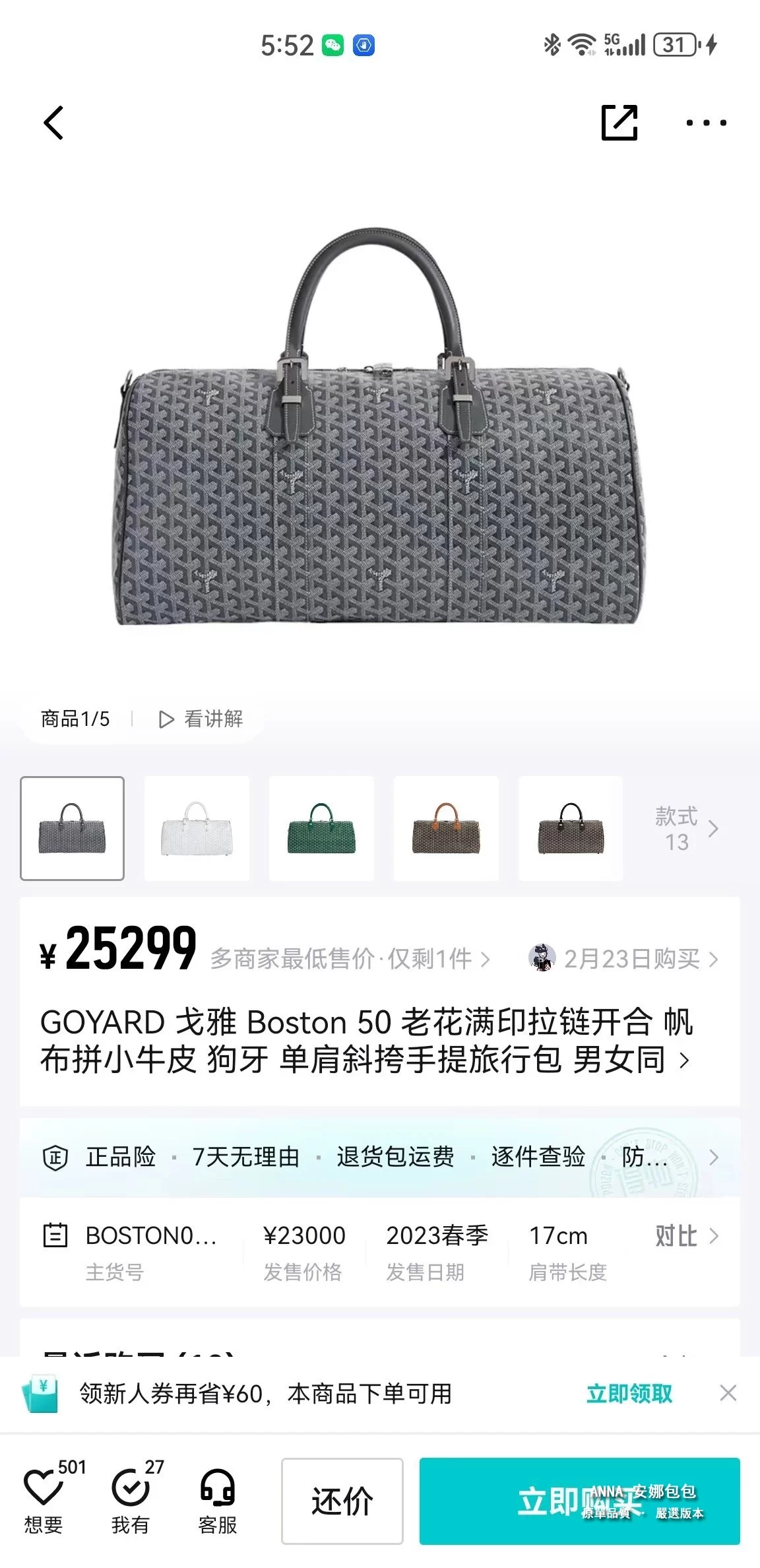 【BM20501-115082】1⃣️:系列2⃣️新品【戈雅】💝🧳Boston45旅行包:使用Goyardine棉麻帆布&Cervon小牛皮製作而成,使包身既輕便靈巧又牢固可靠,掛鎖拉鍊系統更具安全性,Boston45旅行包搭配可拆卸中號肩帶同時兼備手拎、肩背、斜挎實現隨時切換,登機隨身攜帶的理想選擇。型號:020231 尺寸:49×22×27cm