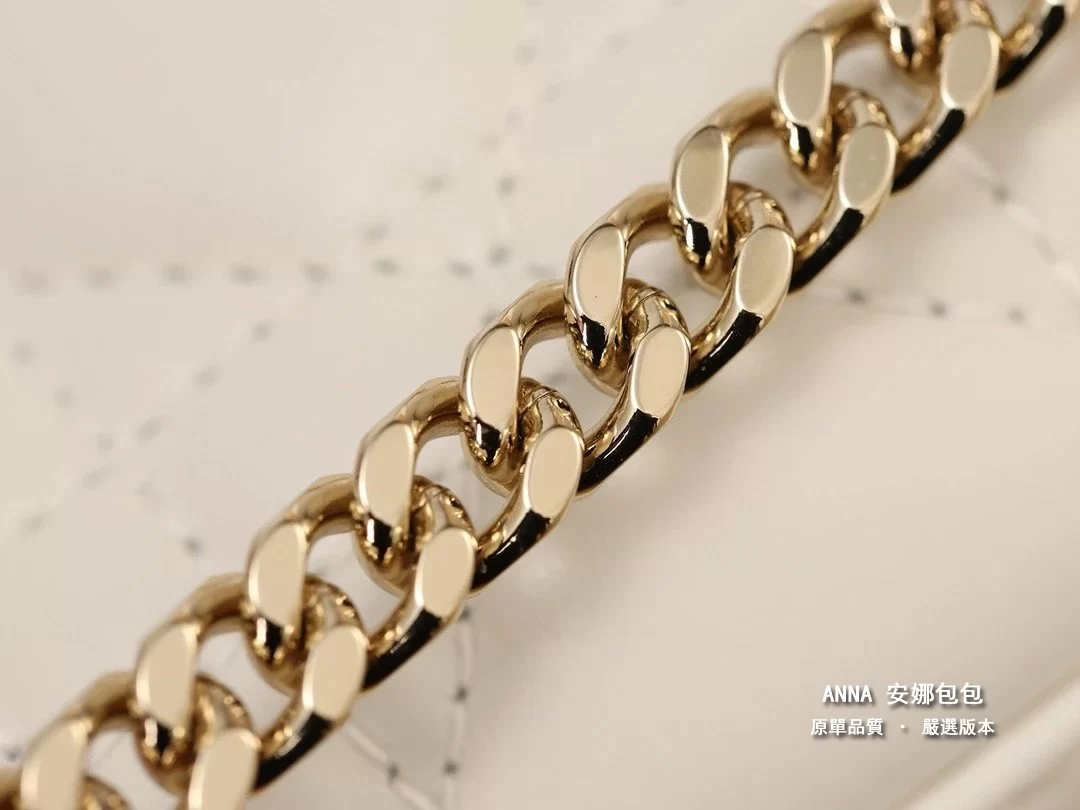 採用奶白色羊皮革精心製作,以藤格紋緝面線打造醒目的絎縫細節,時髦典雅的設計經久不衰。