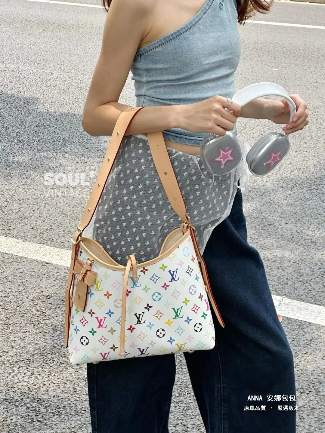 路易威登 Carryall 白三彩村上隆 彩色老花 原單尾貨 斜背購物袋(M13661)