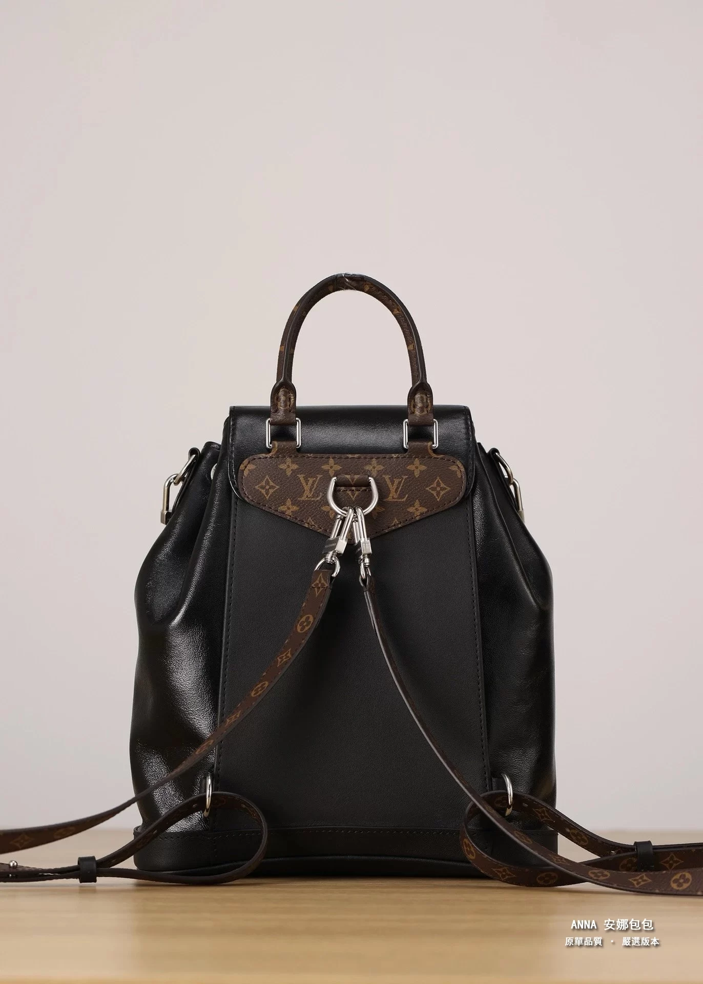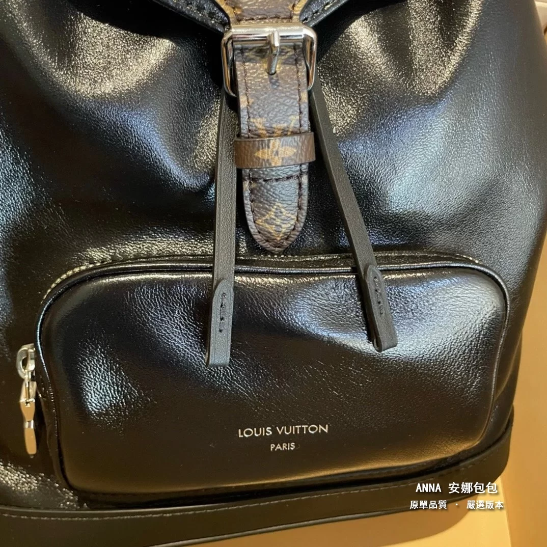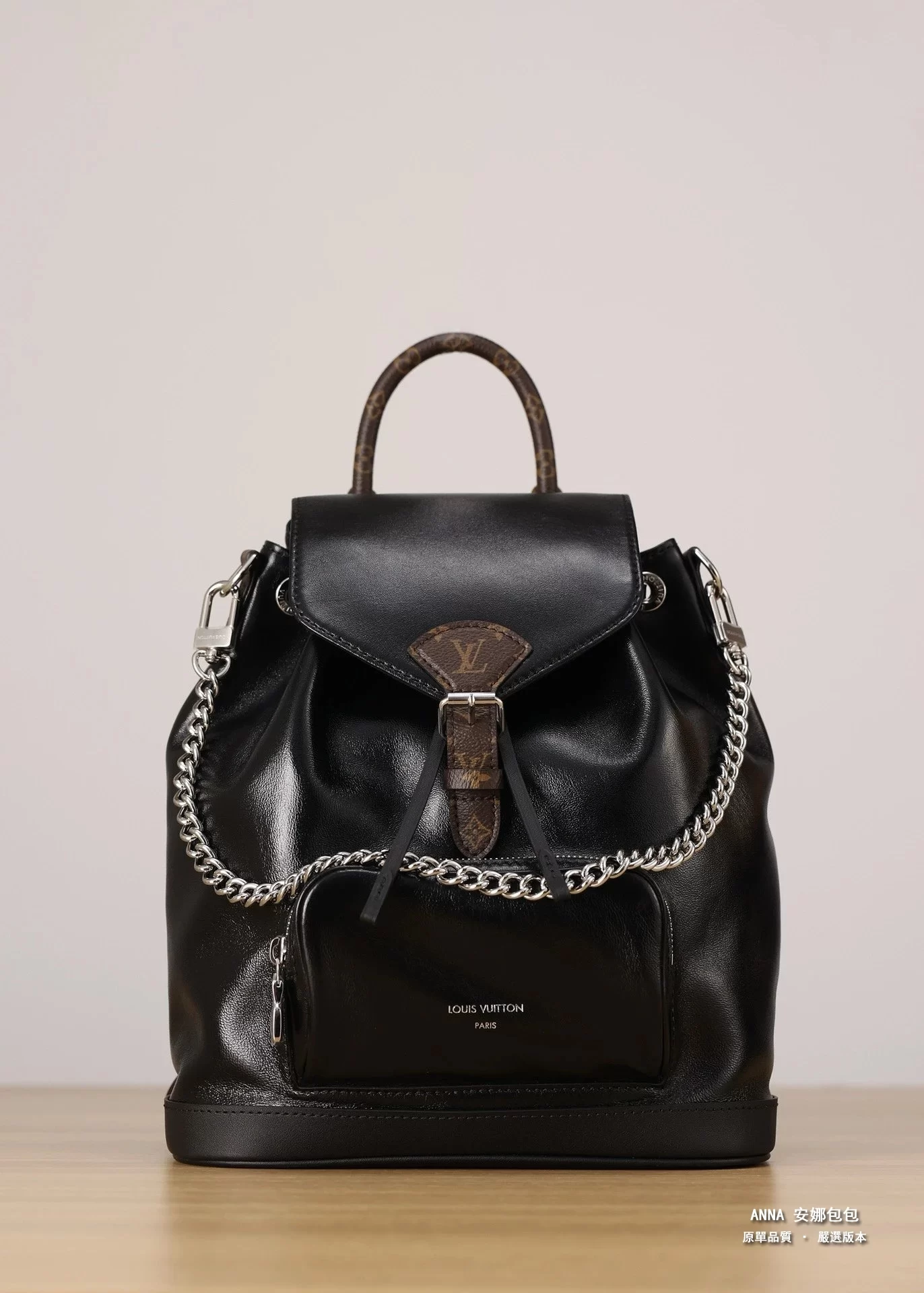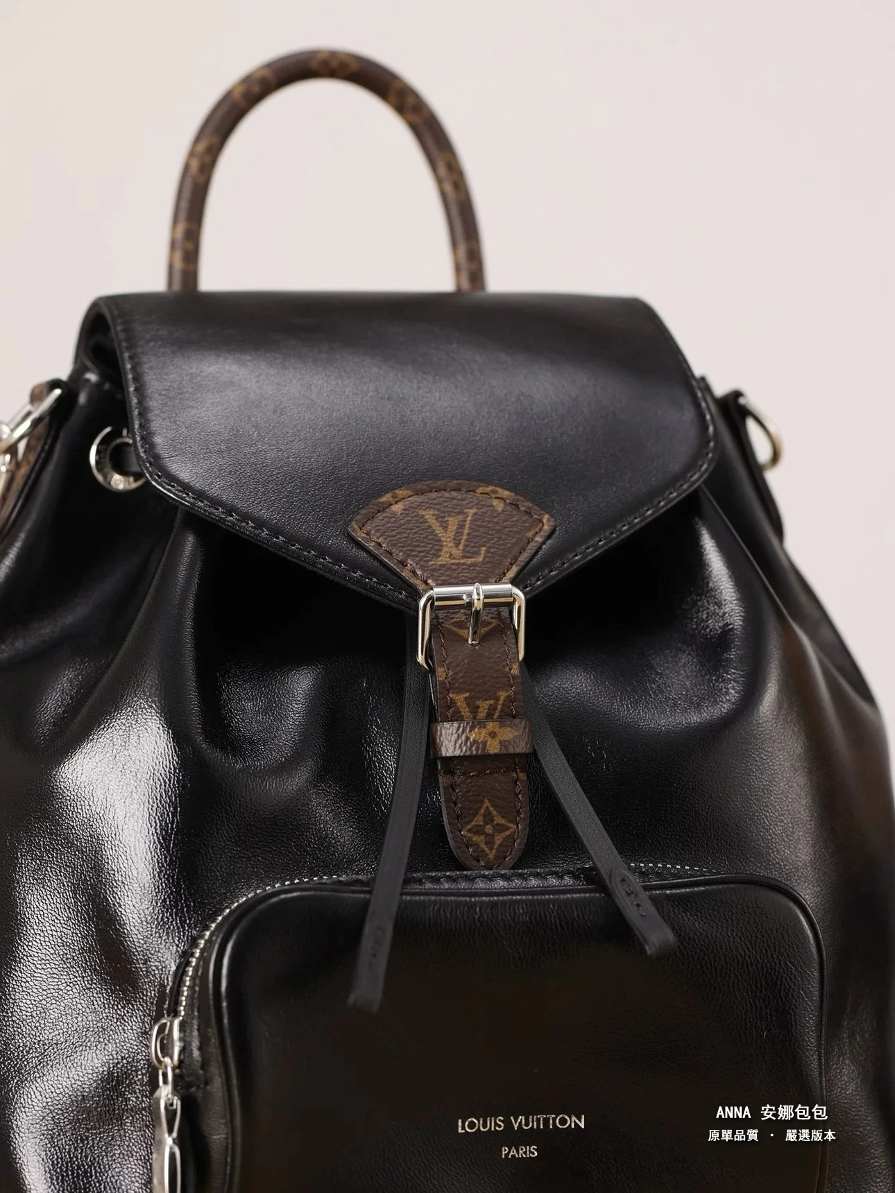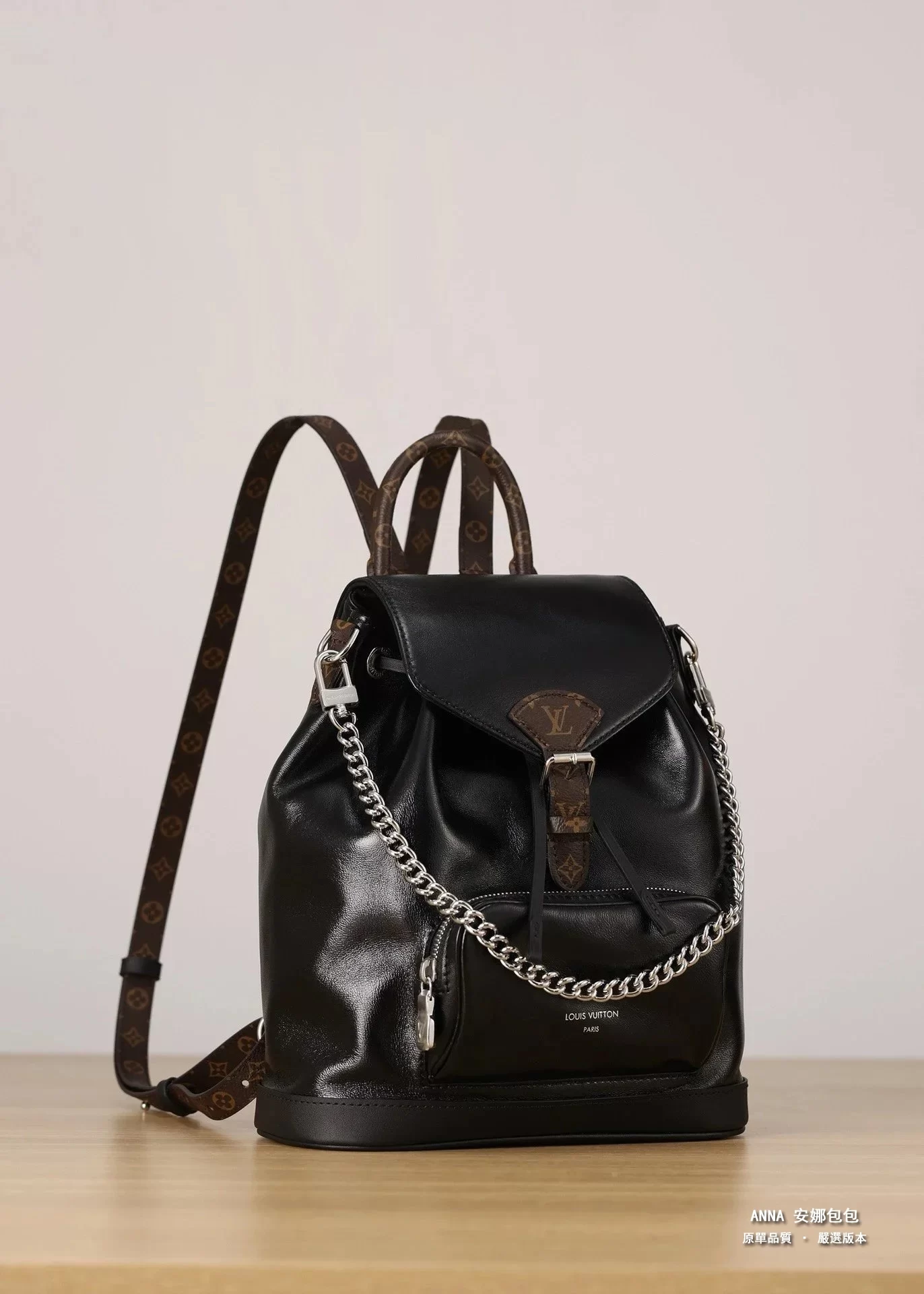 本款 Montsouris 小號雙肩包爲亮澤羊皮革融入 Monogram 細節,巧妙道出 LV Vibe 系列身份。