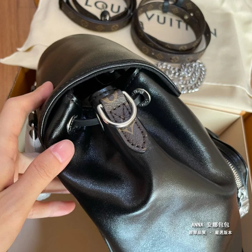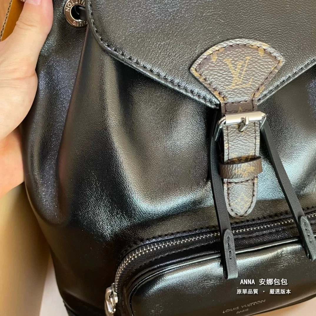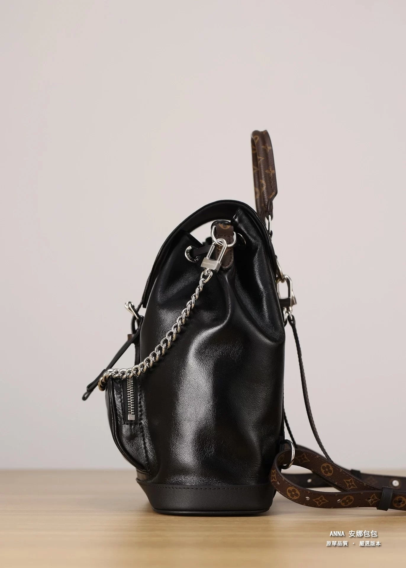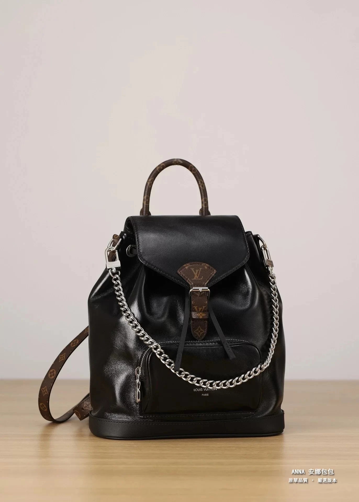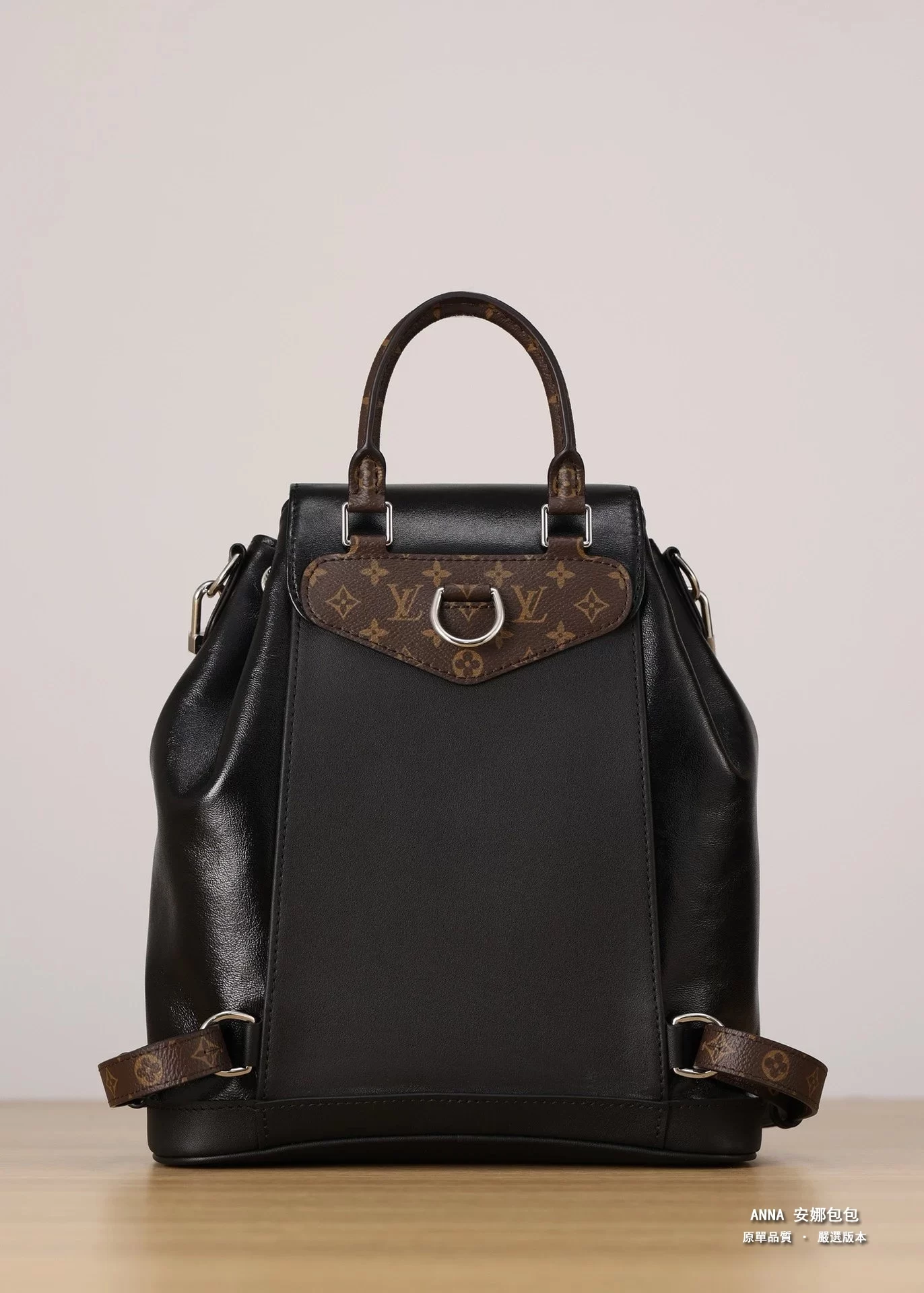 本款 Montsouris 小號雙肩包爲亮澤羊皮革融入 Monogram 細節,巧妙道出 LV Vibe 系列身份。