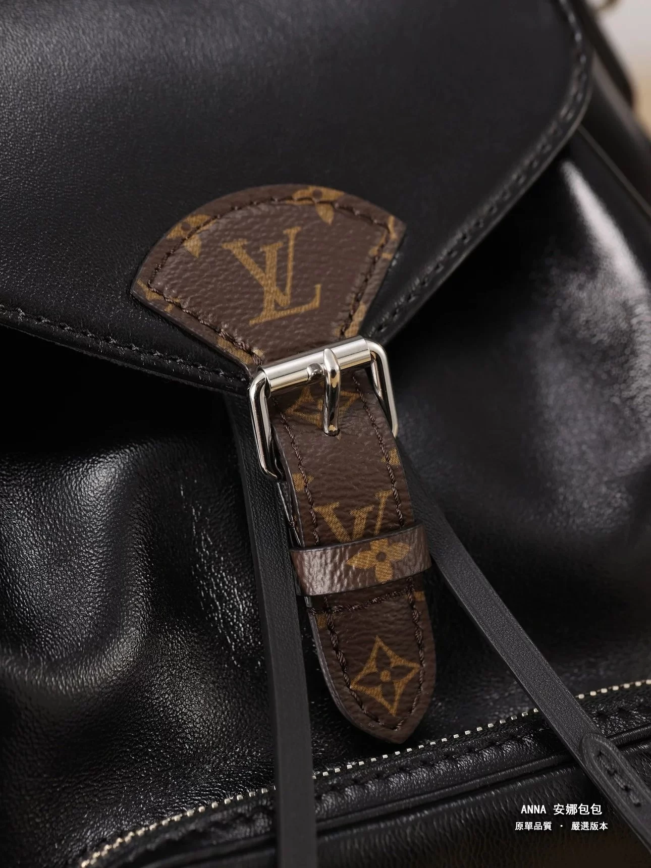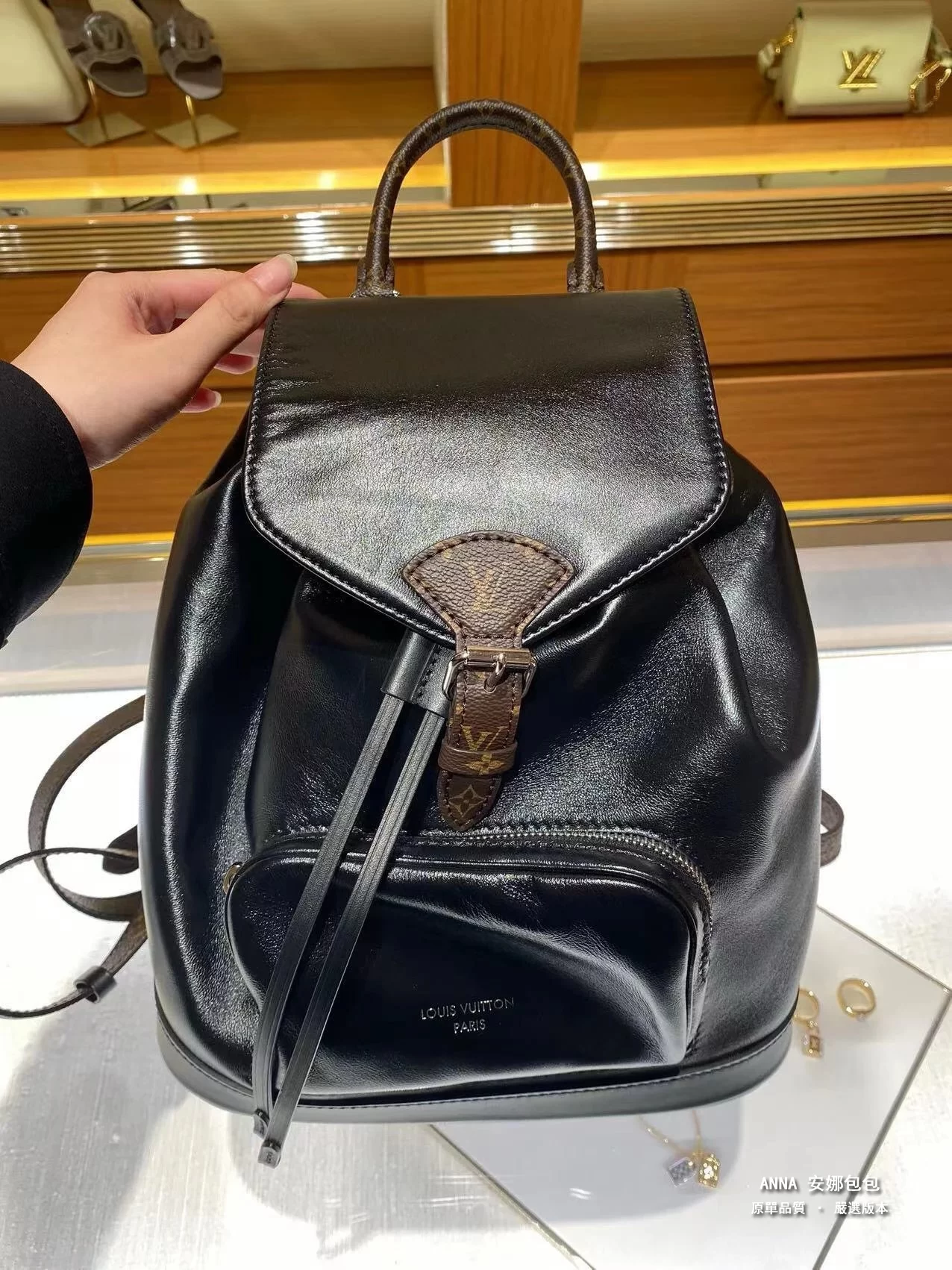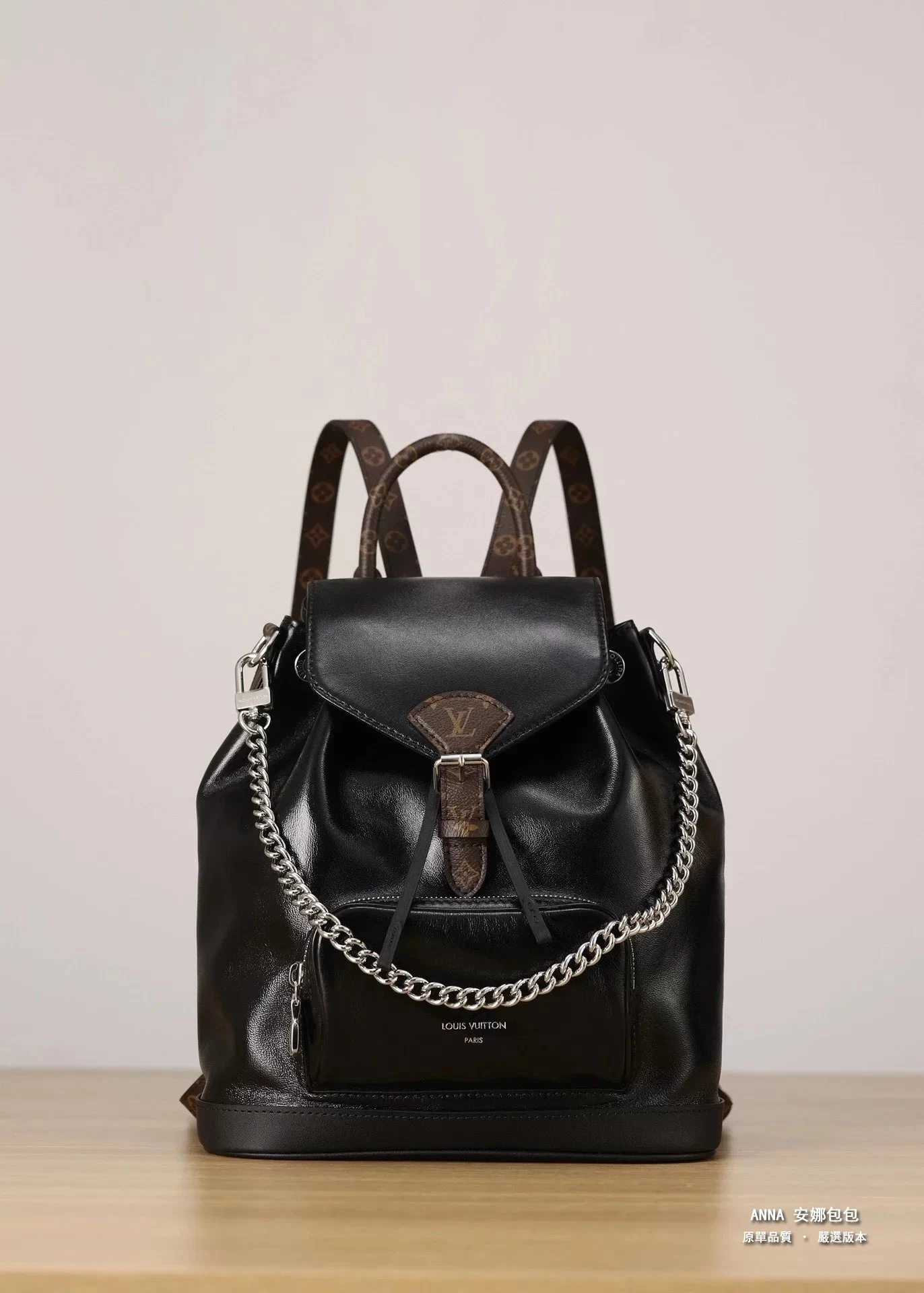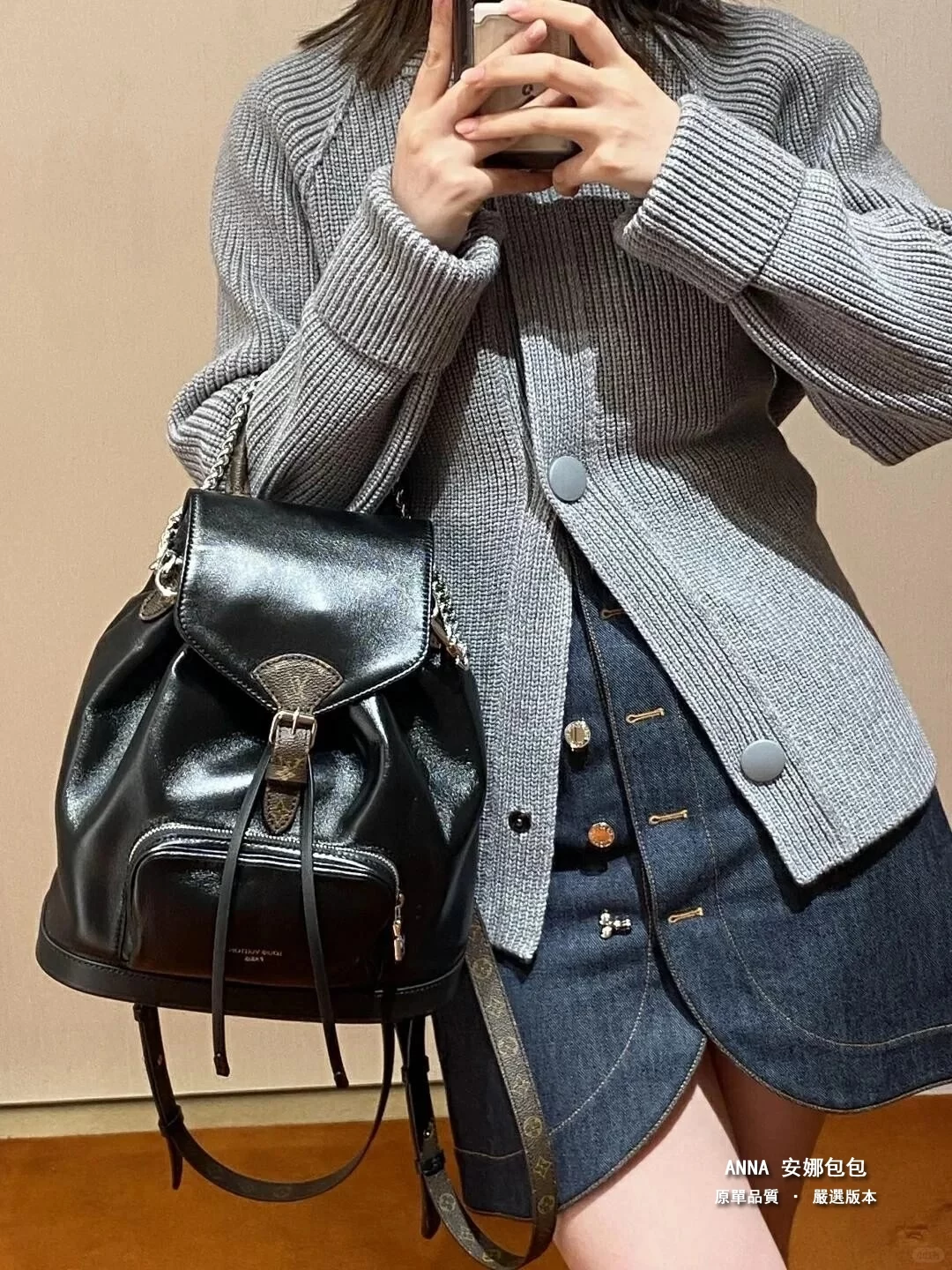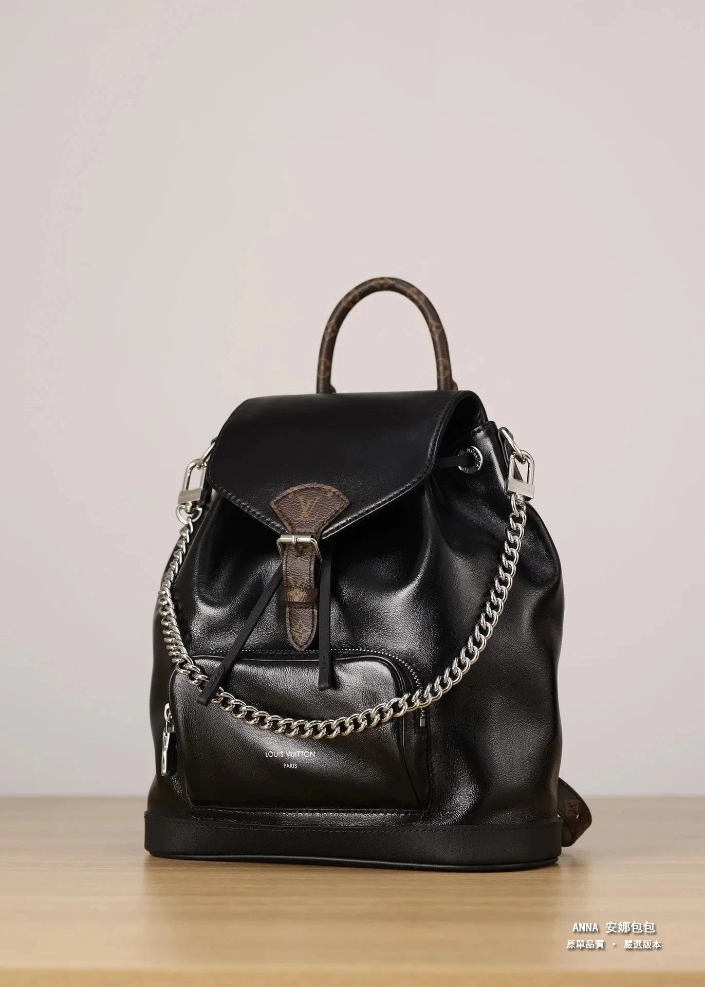 本款 Montsouris 小號雙肩包爲亮澤羊皮革融入 Monogram 細節,巧妙道出 LV Vibe 系列身份。
