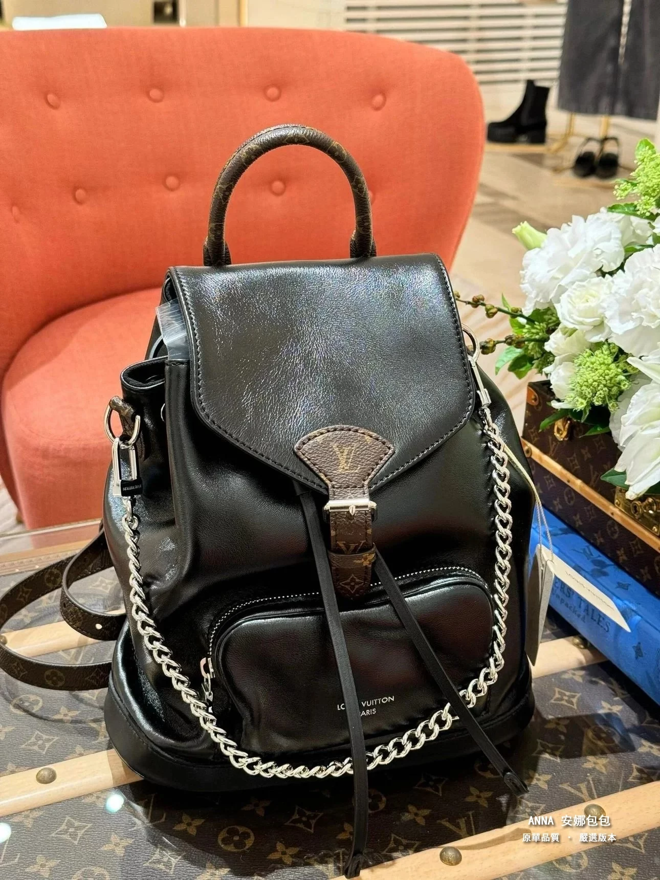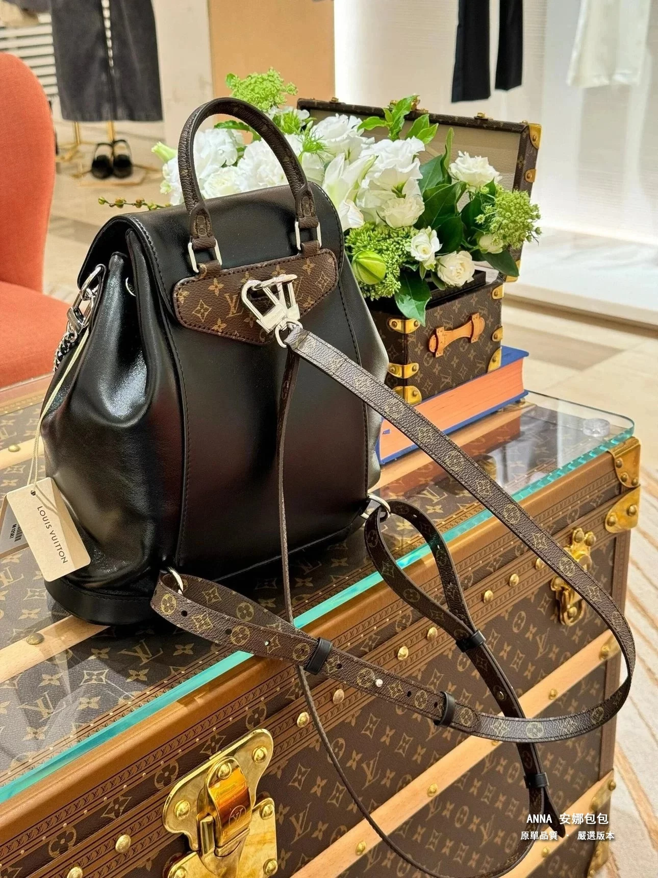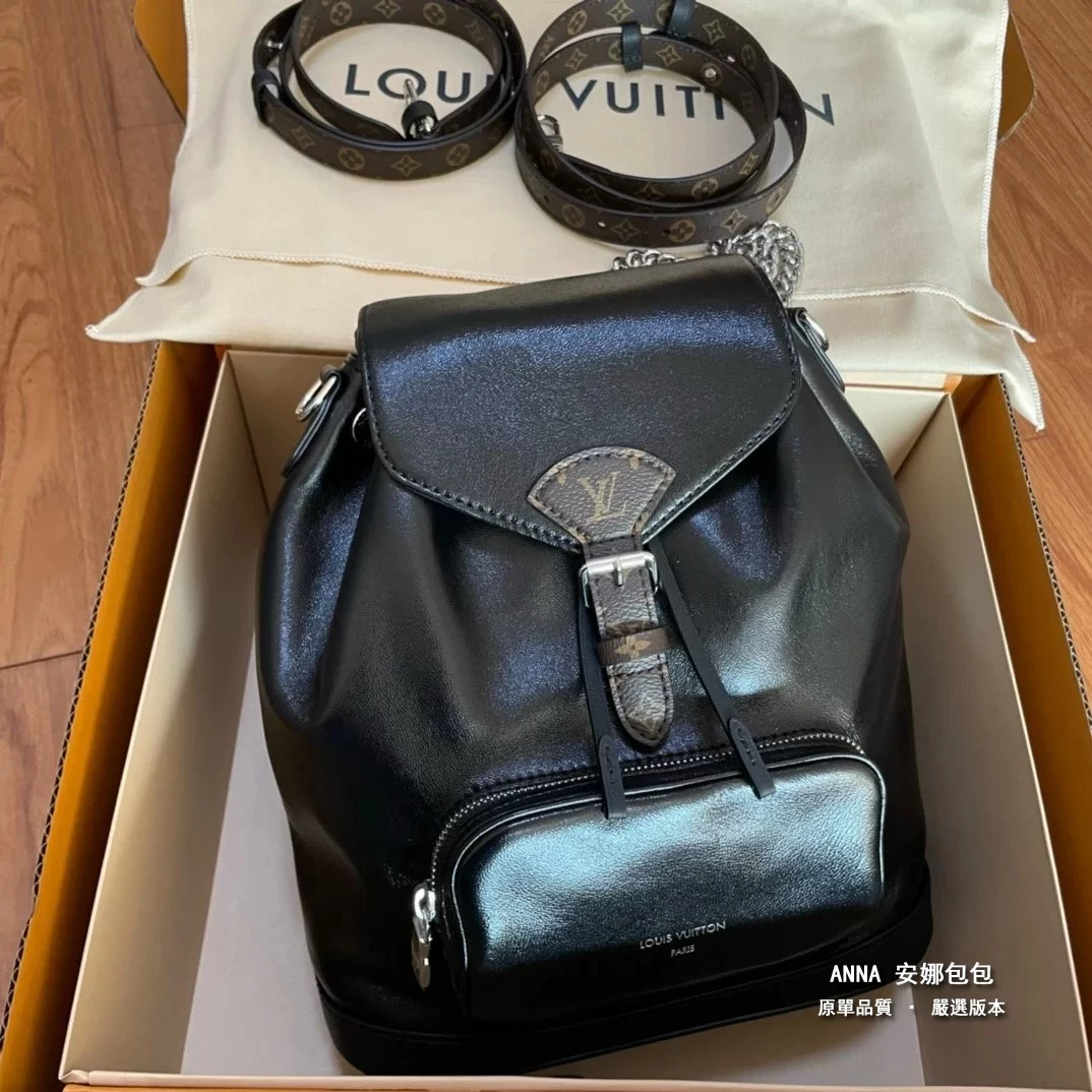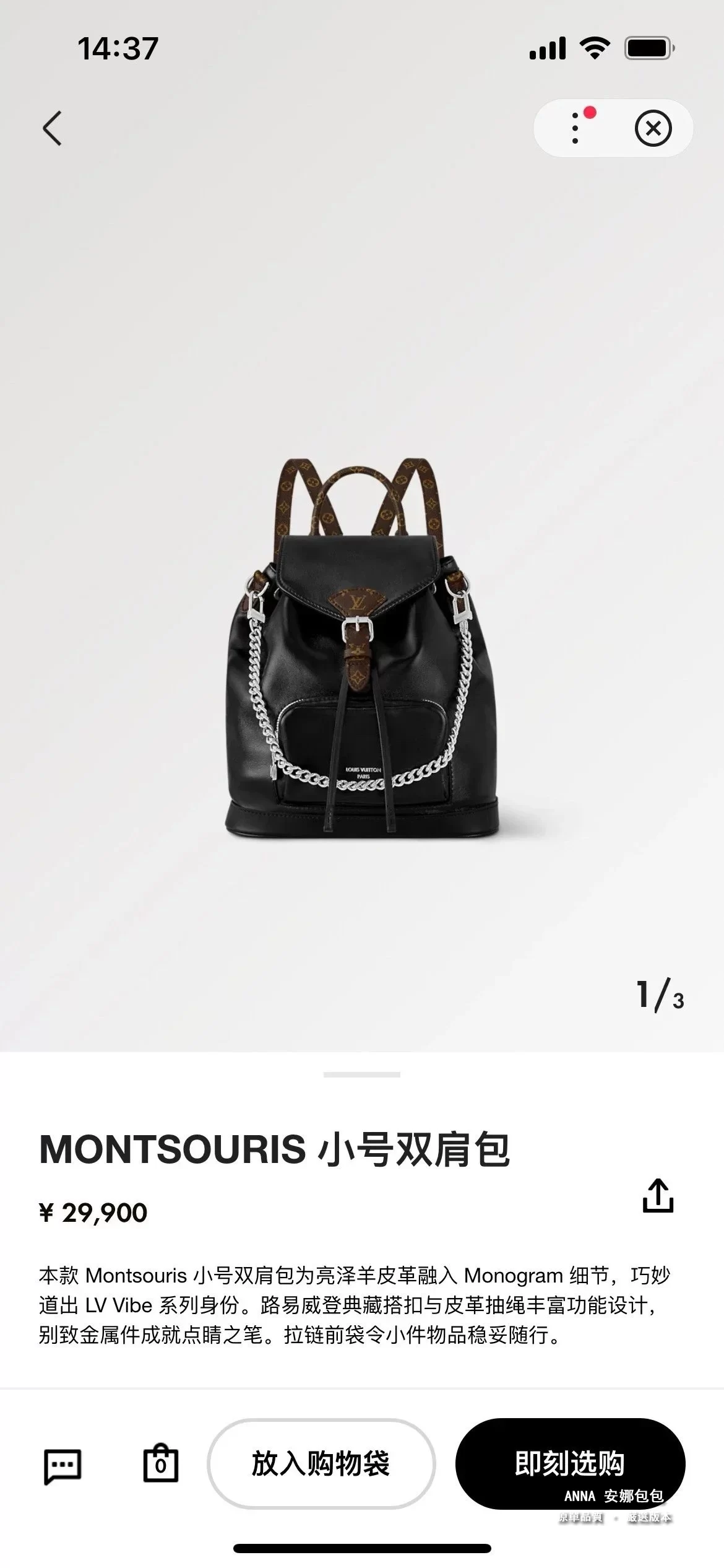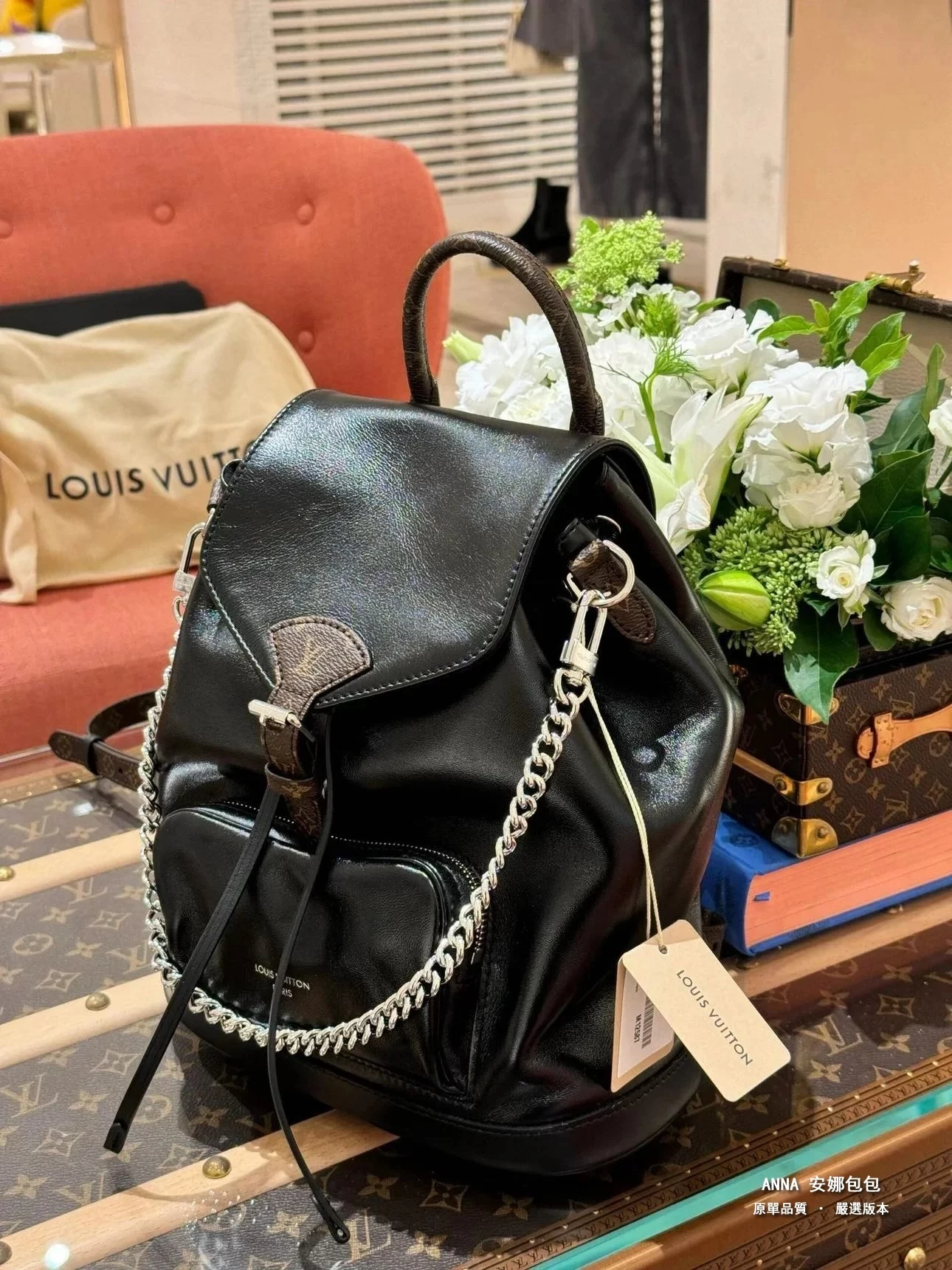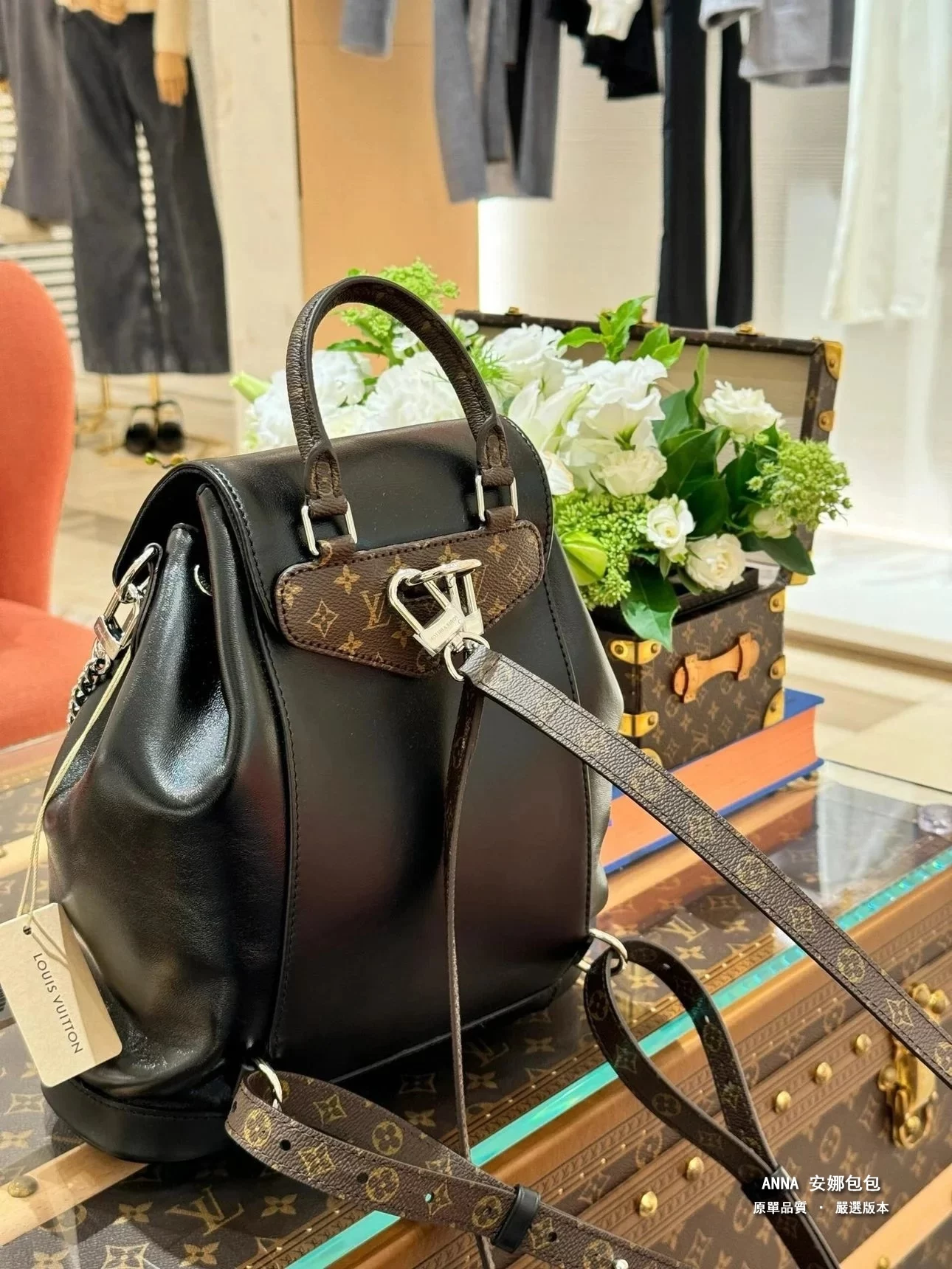 本款 Montsouris 小號雙肩包爲亮澤羊皮革融入 Monogram 細節,巧妙道出 LV Vibe 系列身份。