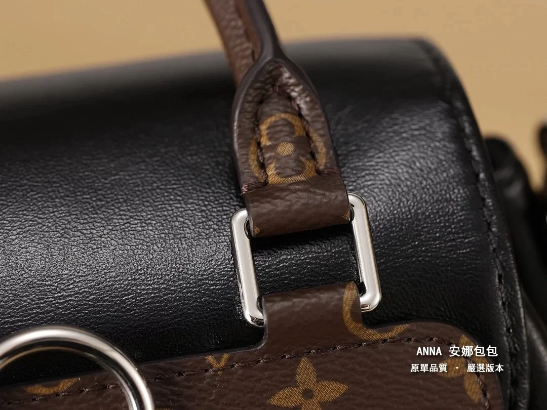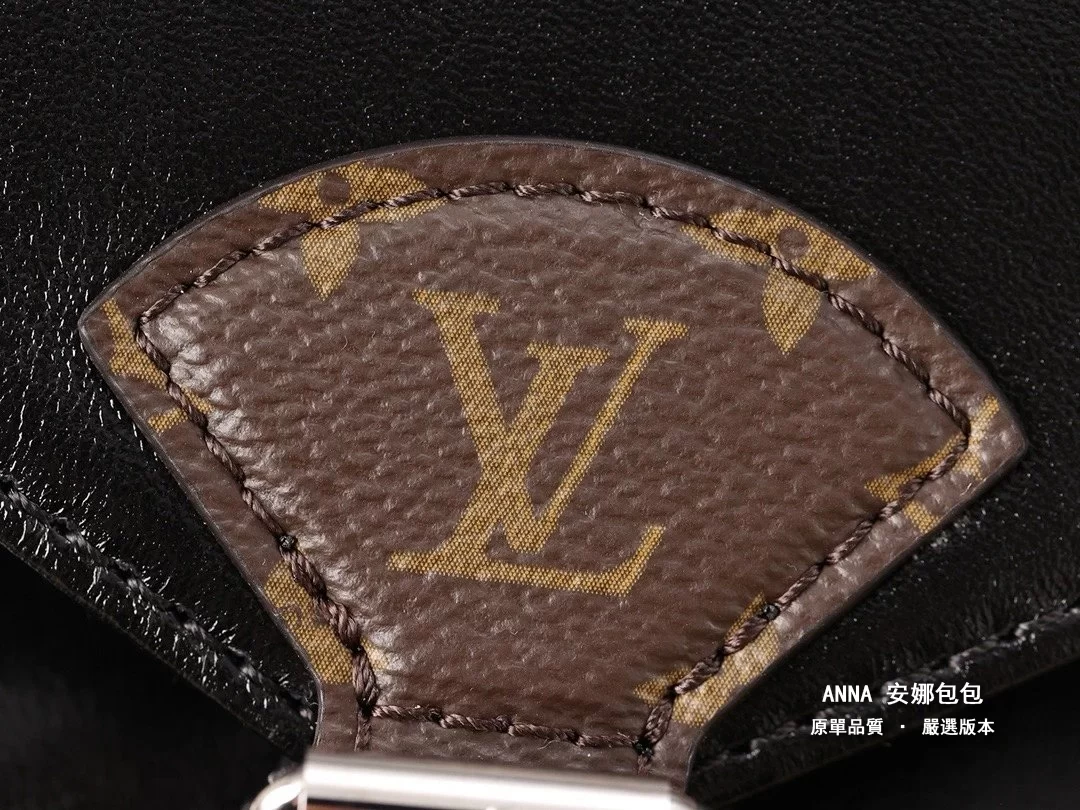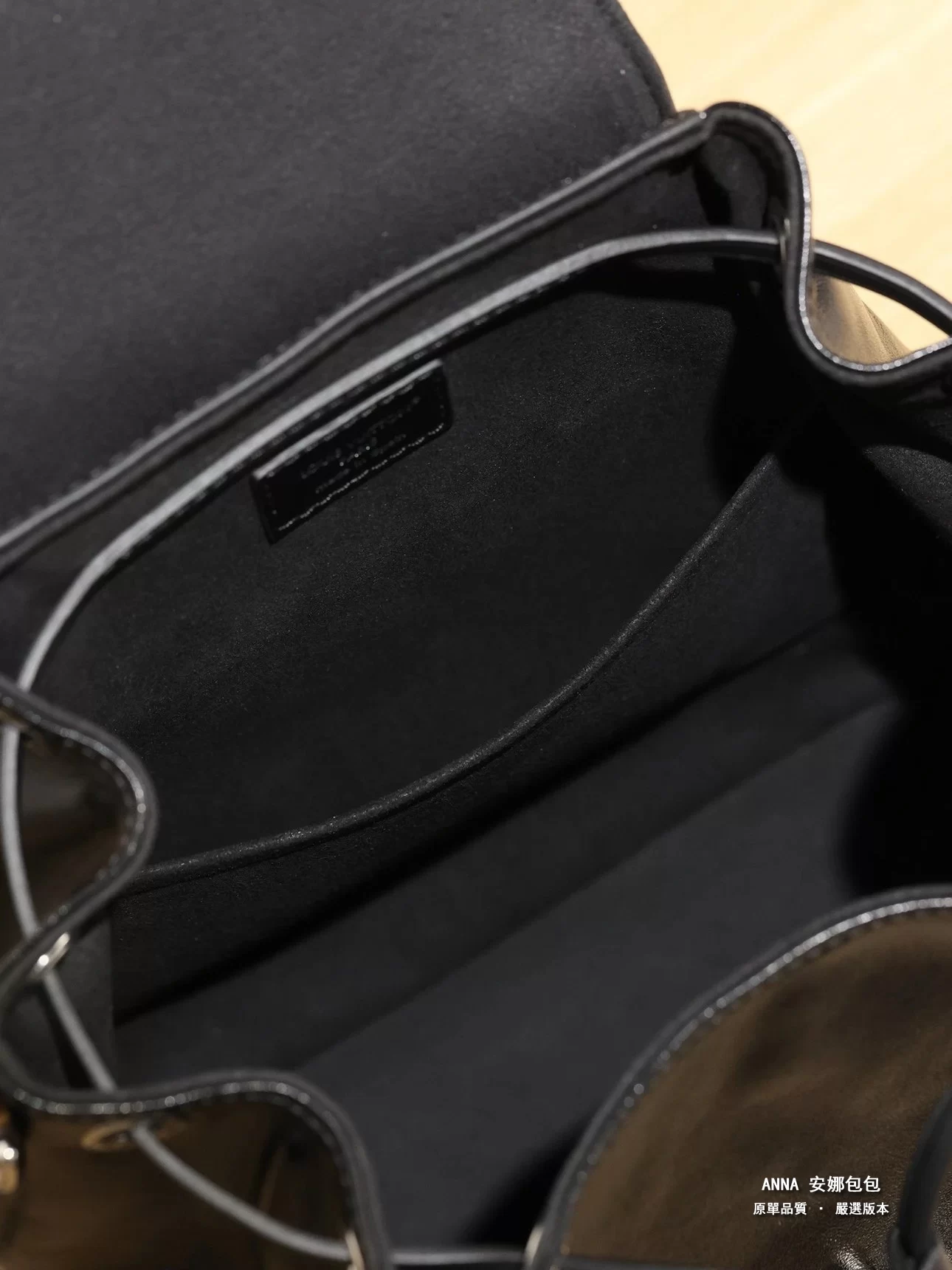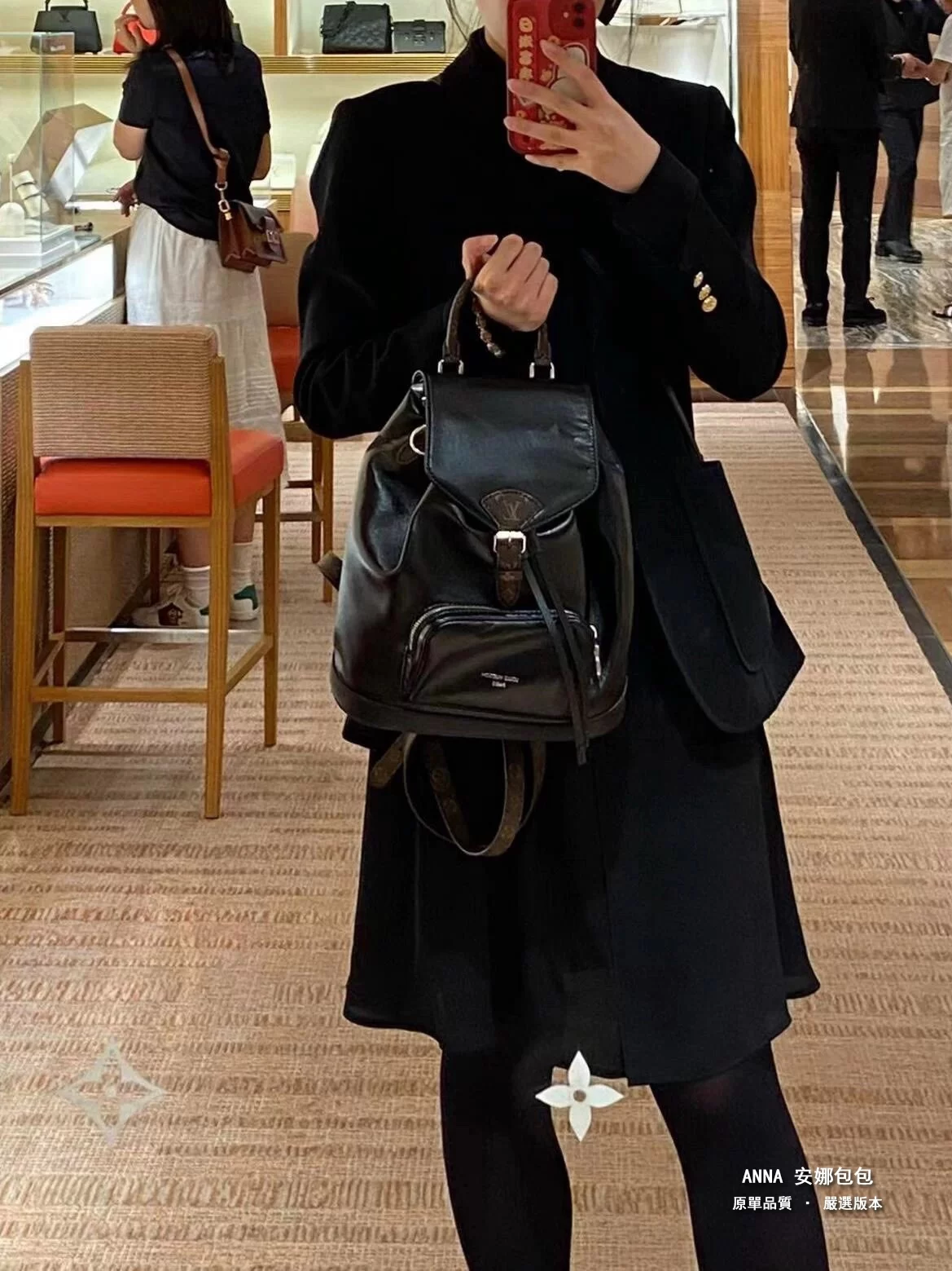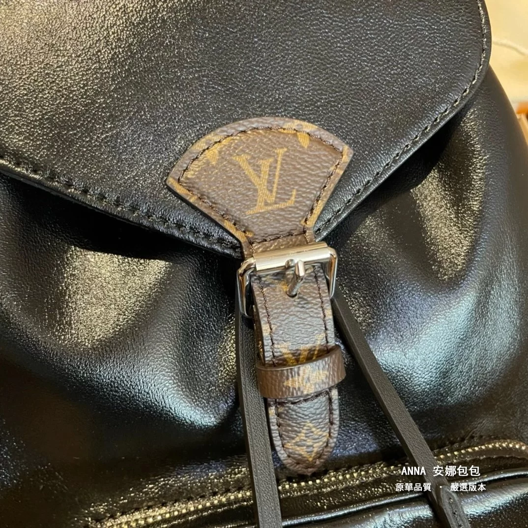 本款 Montsouris 小號雙肩包爲亮澤羊皮革融入 Monogram 細節,巧妙道出 LV Vibe 系列身份。