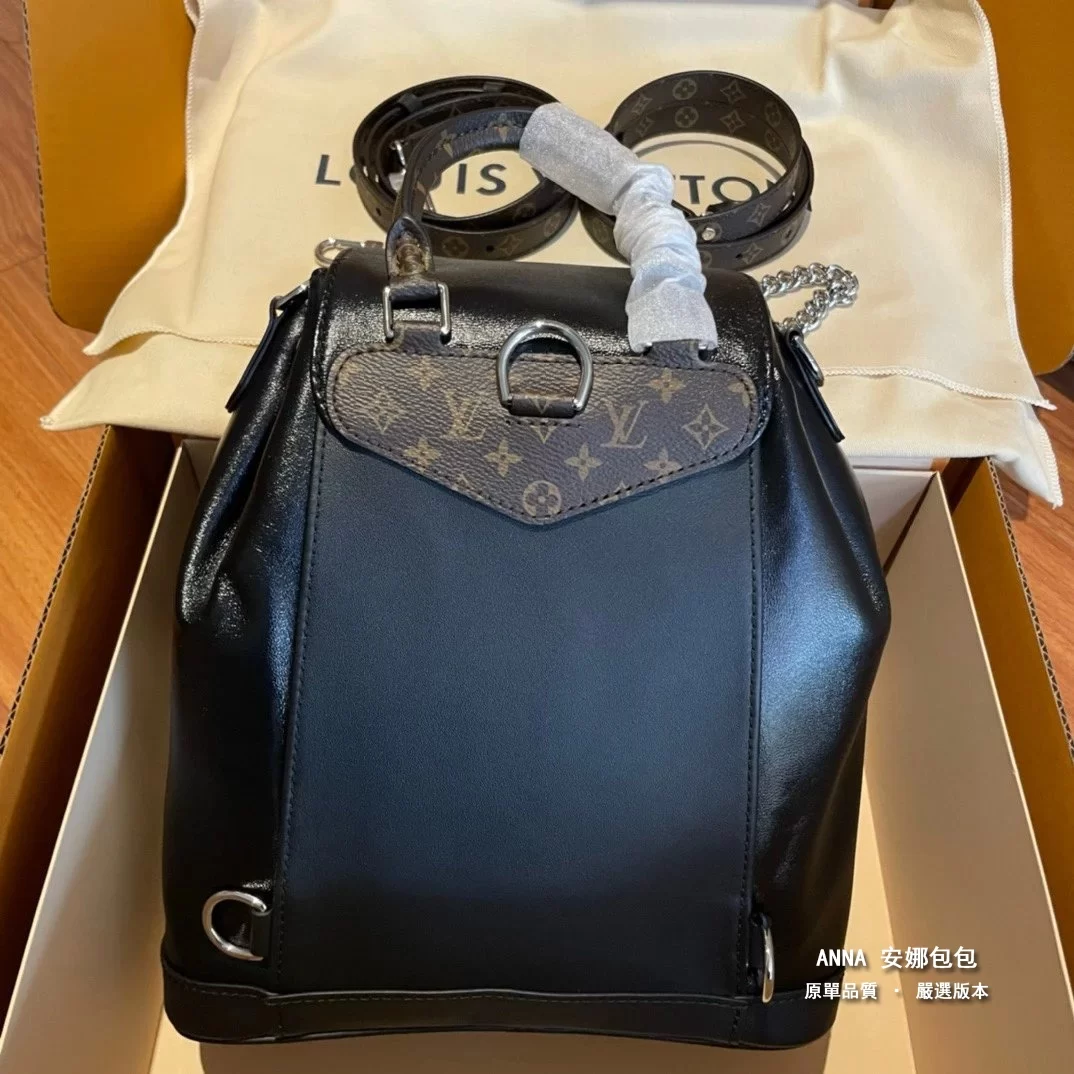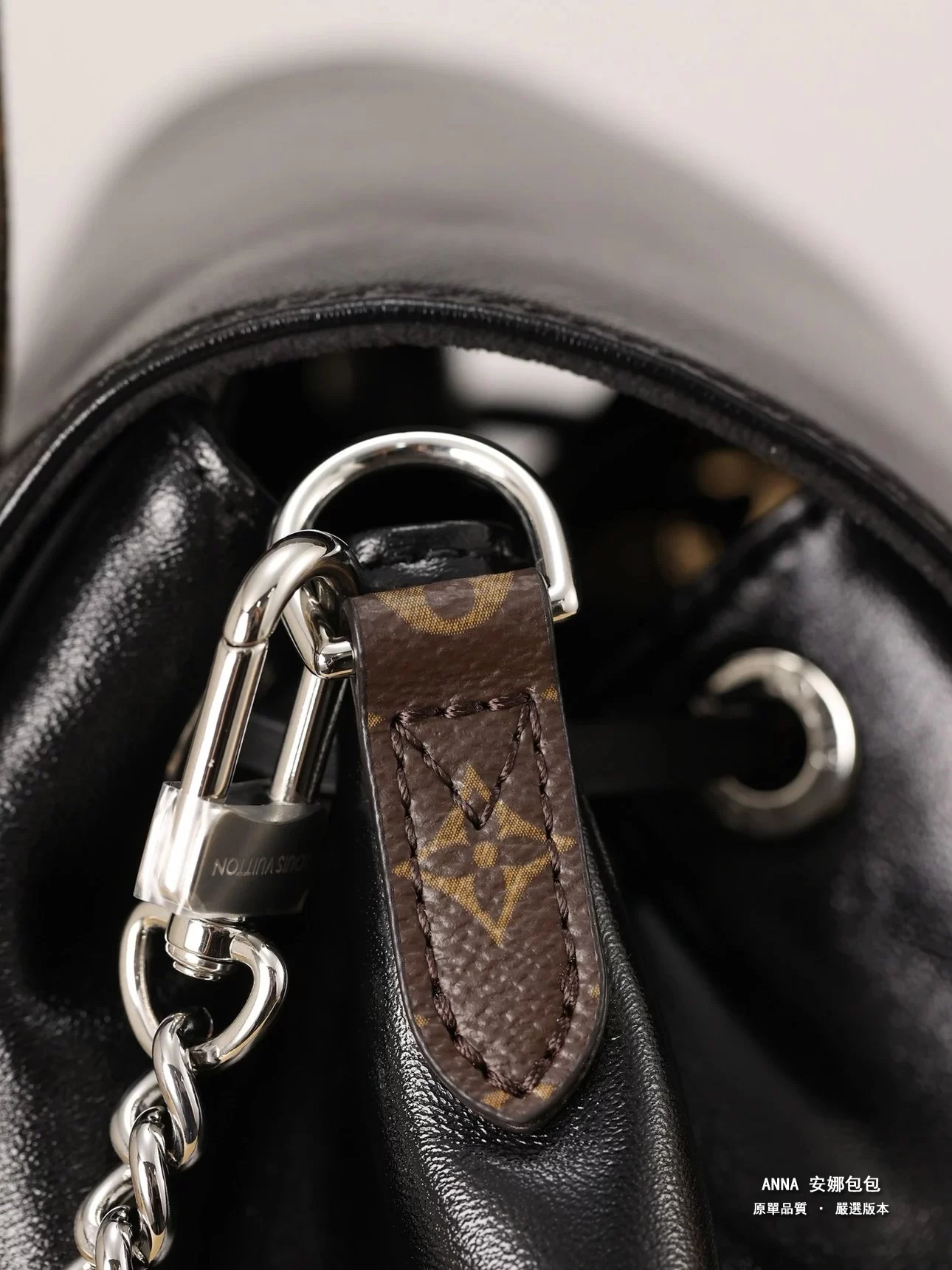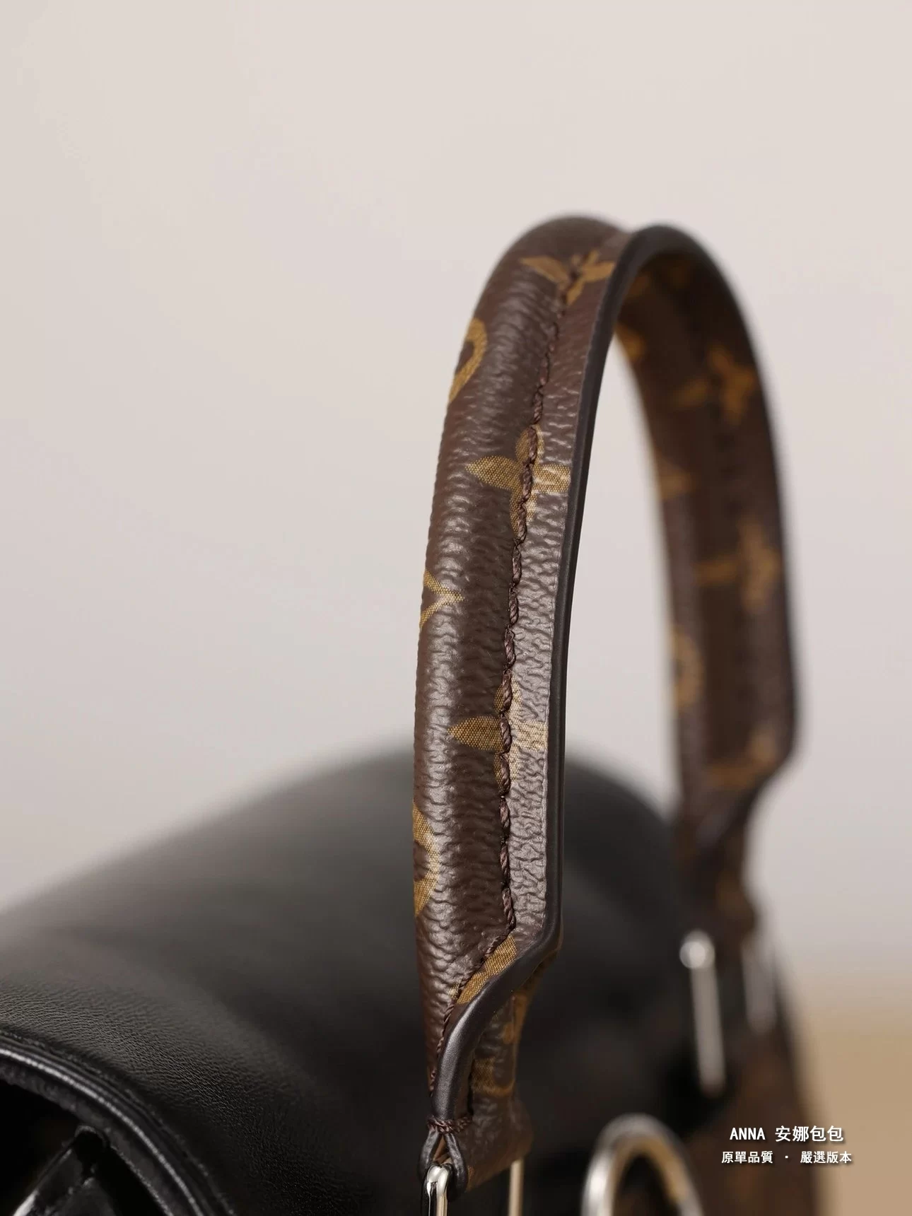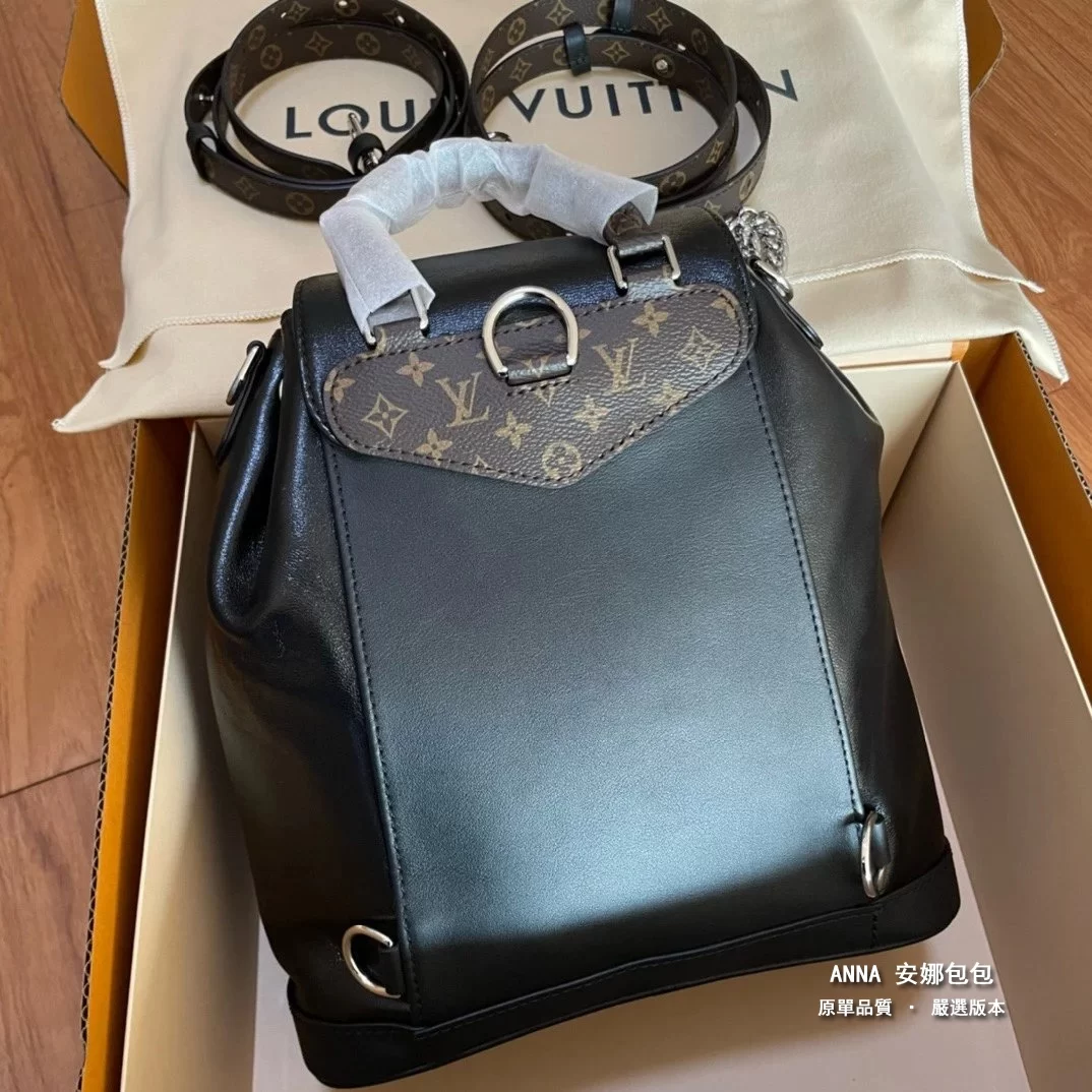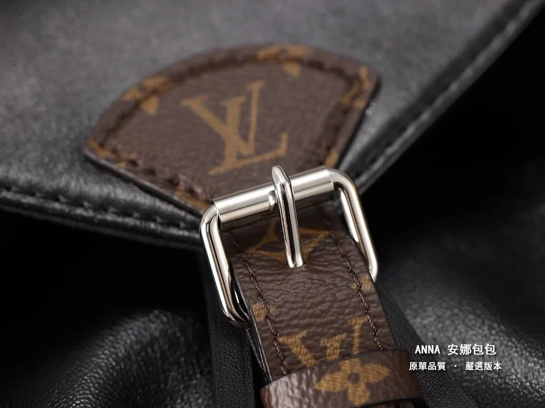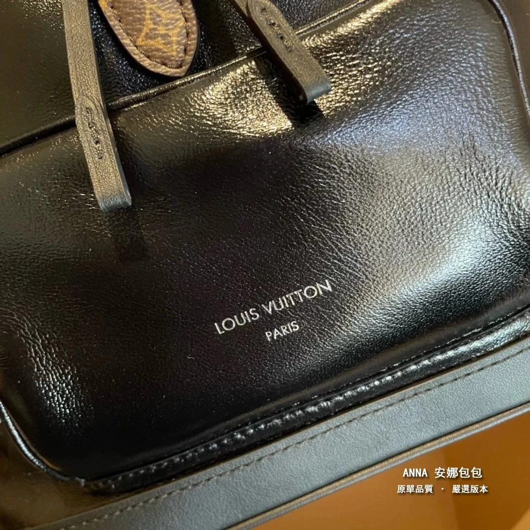 本款 Montsouris 小號雙肩包爲亮澤羊皮革融入 Monogram 細節,巧妙道出 LV Vibe 系列身份。