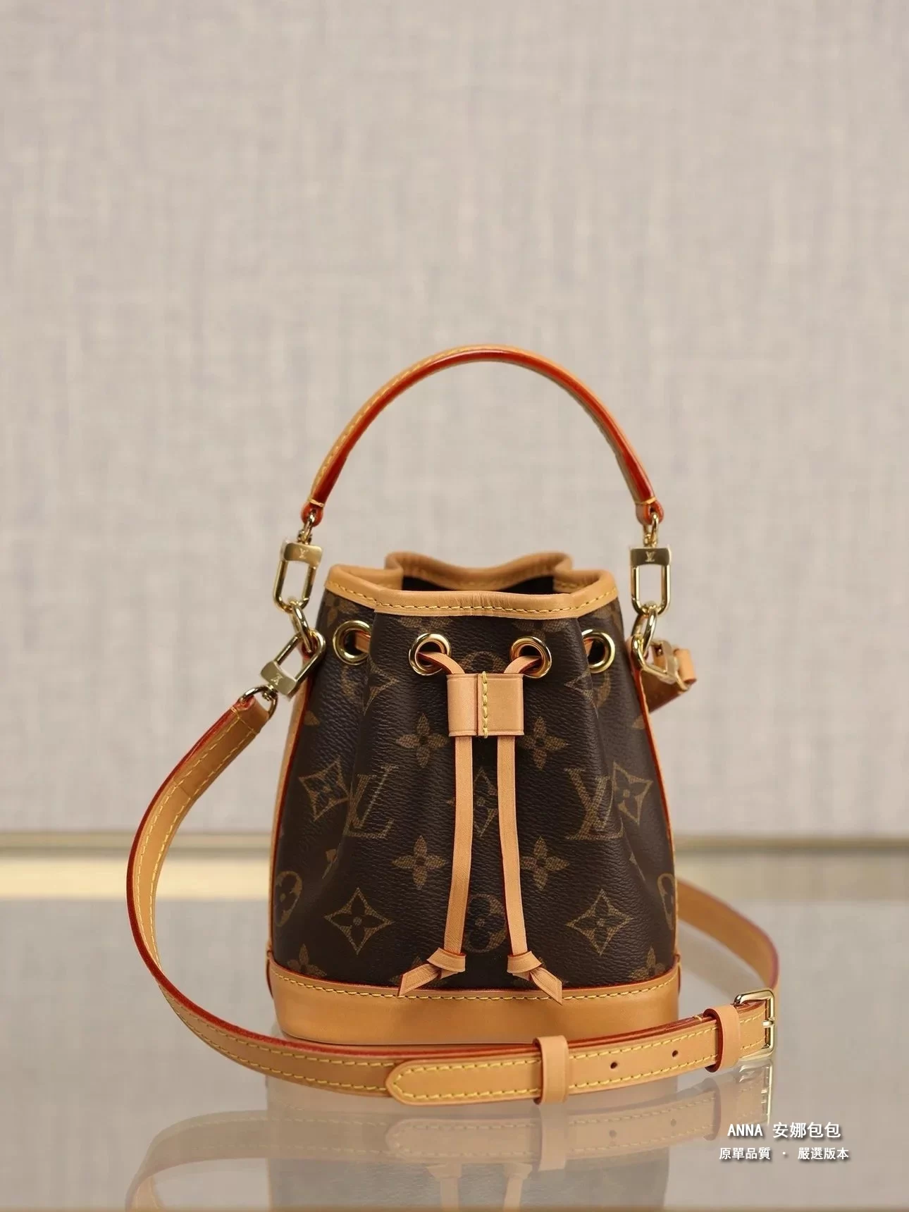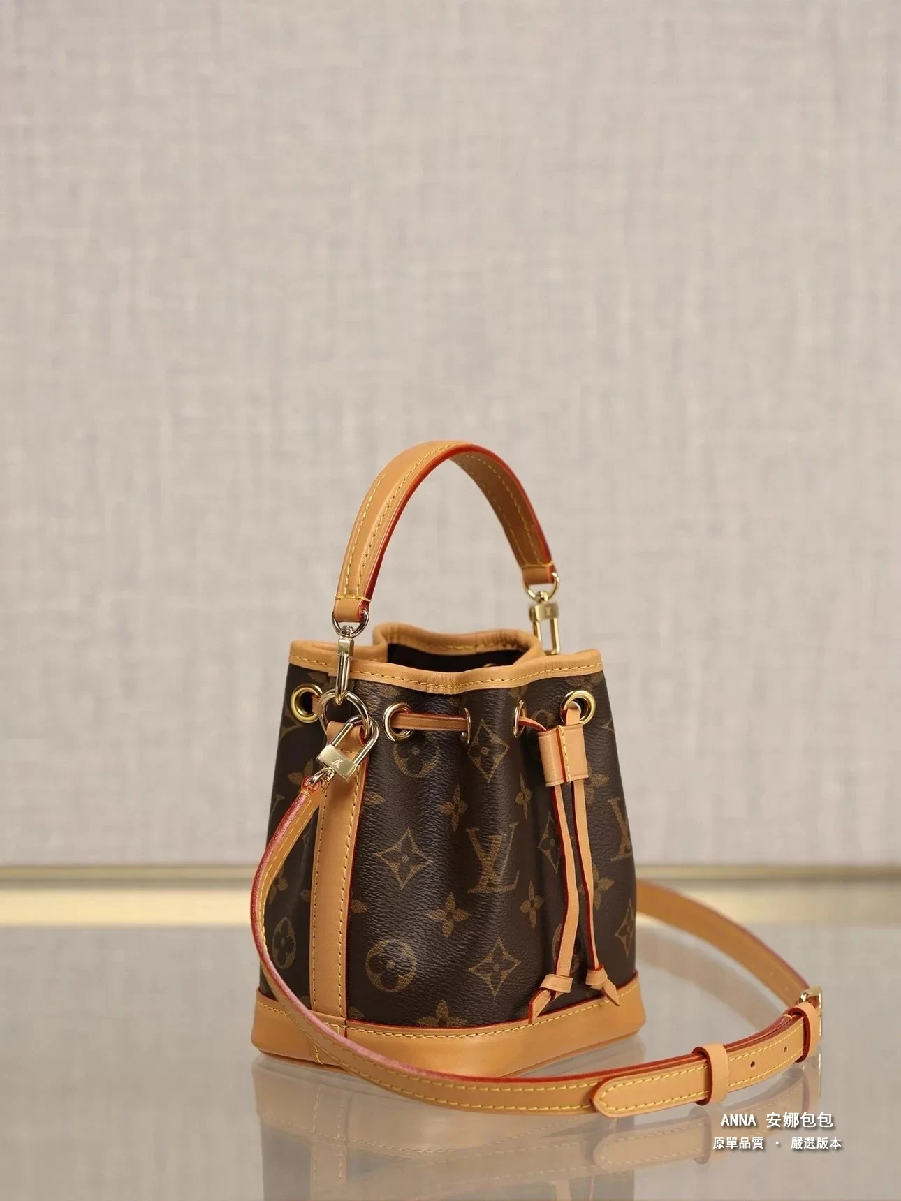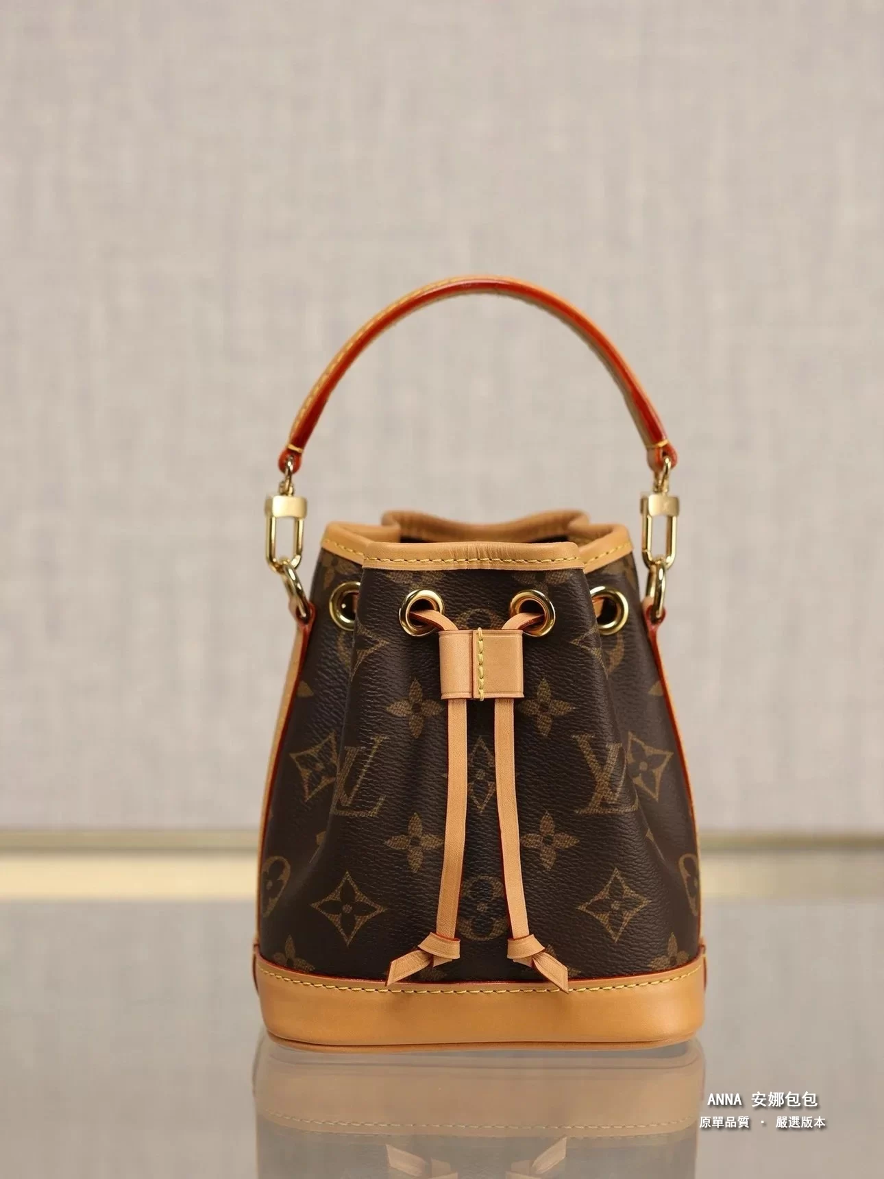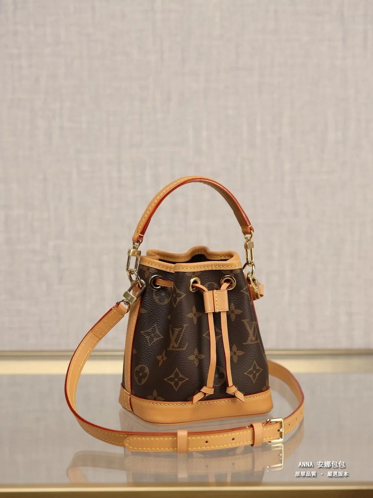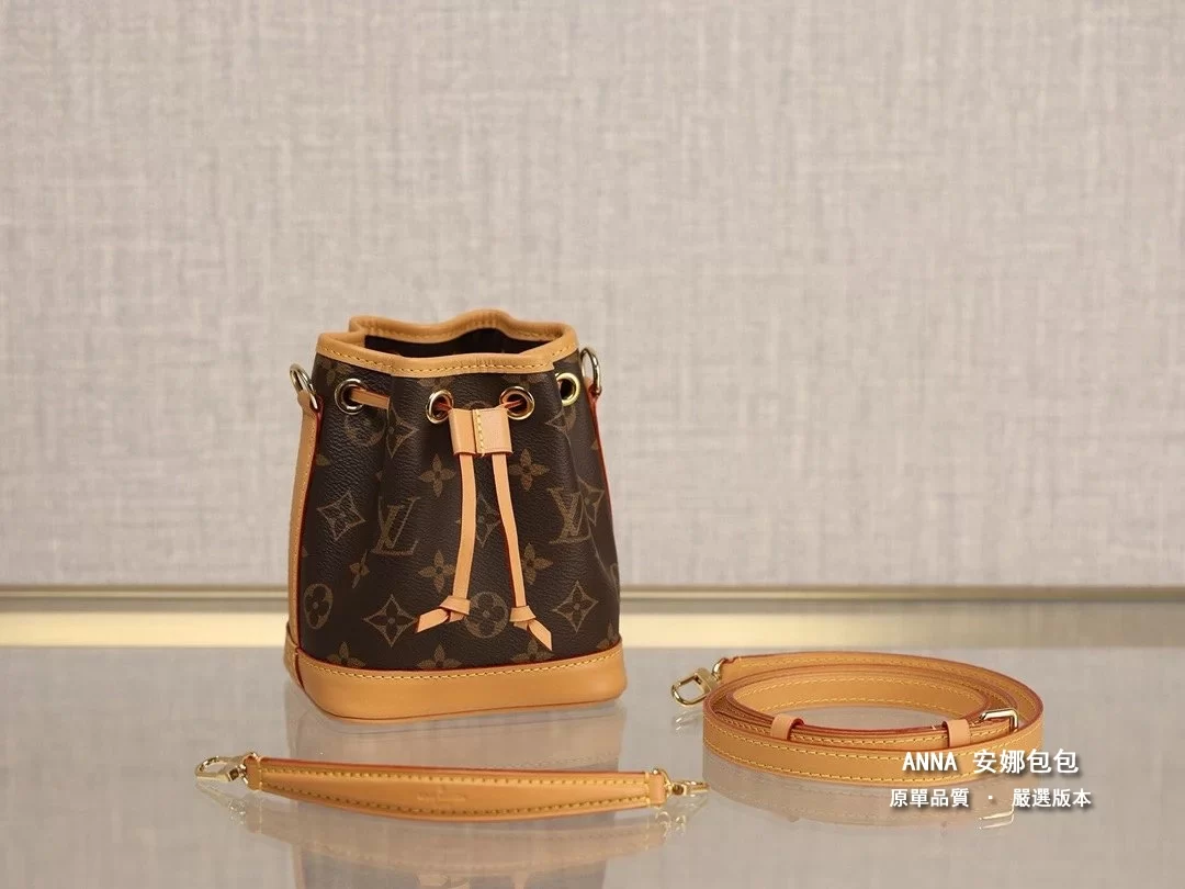 本款 Nano Noé 手袋濃縮 1932 年 Noé 手袋的經典構型,以 Monogram 帆布和牛皮革飾邊融合傳統設計和當代功能。