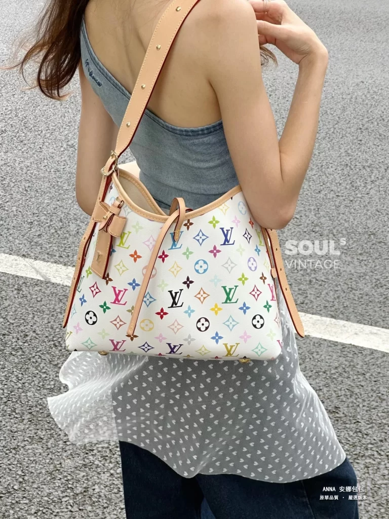 路易威登 Carryall 白三彩村上隆 彩色老花 原單尾貨 斜背購物袋(M13661)