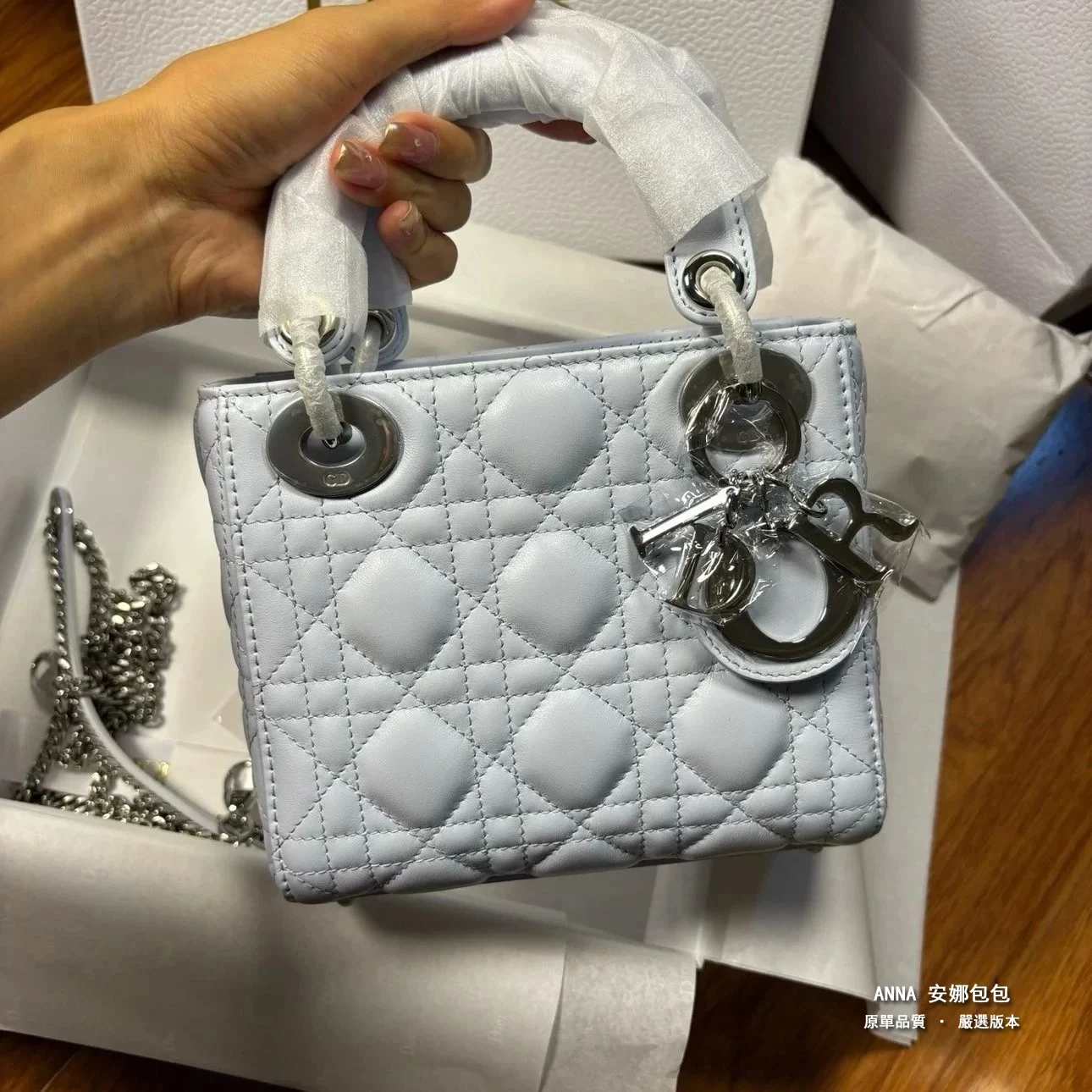 迪奧 藤格紋迷你手提包|冰川藍羊皮・銀色吊飾・可拆鏈條|頂級版本