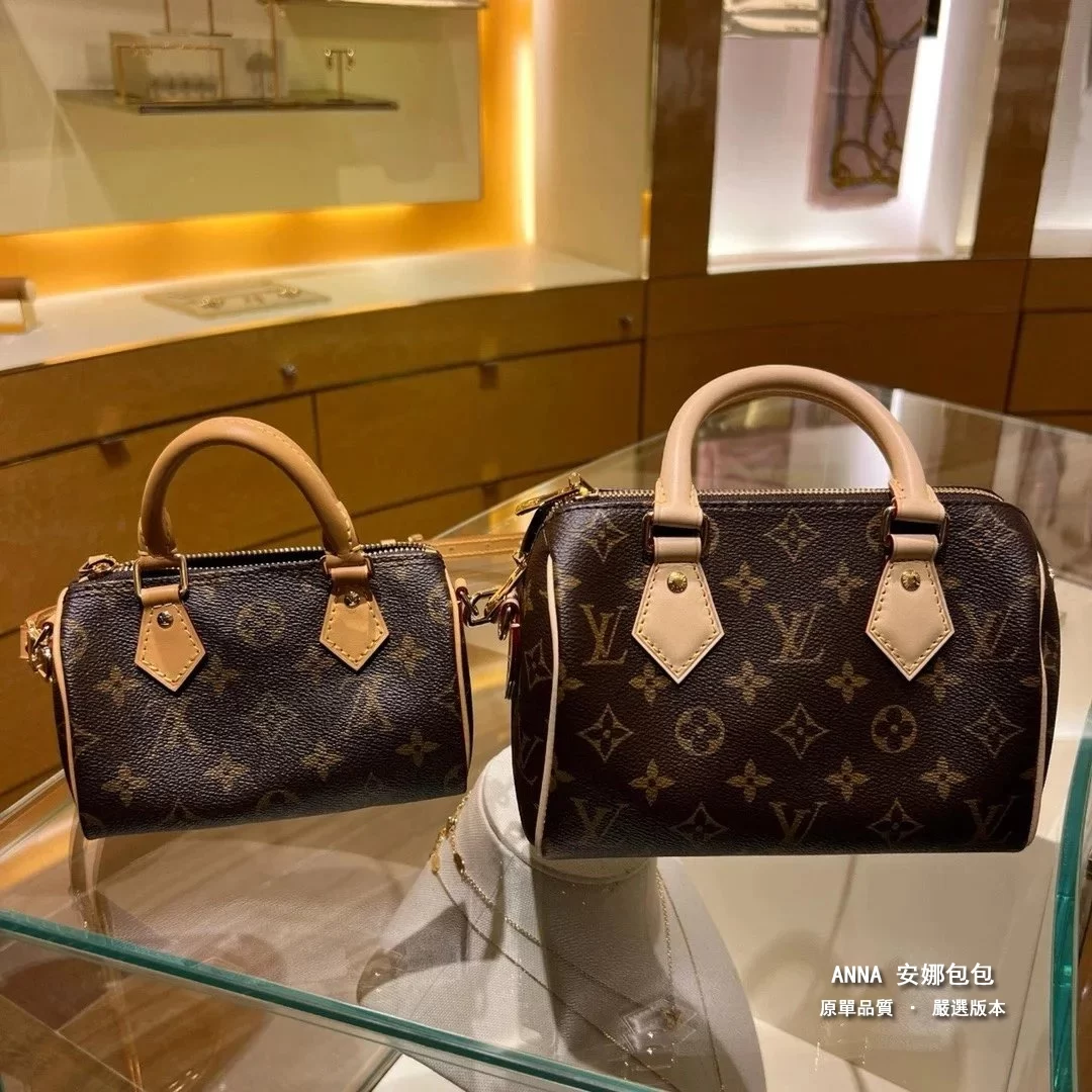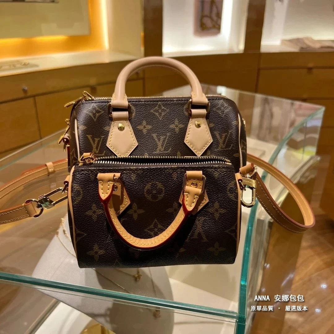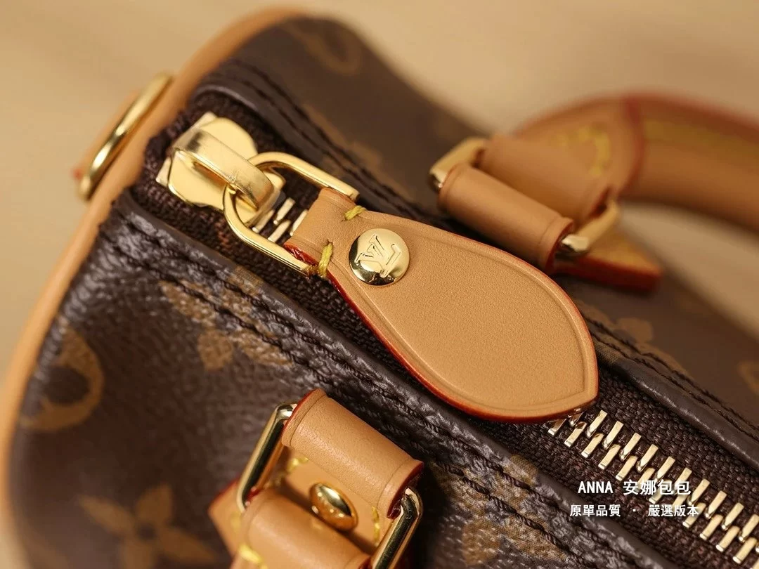 Nano Speedy 手袋濃縮路易威登經典 Speedy 手袋構型,以 Monogram 帆布塑造玲瓏設計,搭配做舊牛皮革細節和金屬件。
