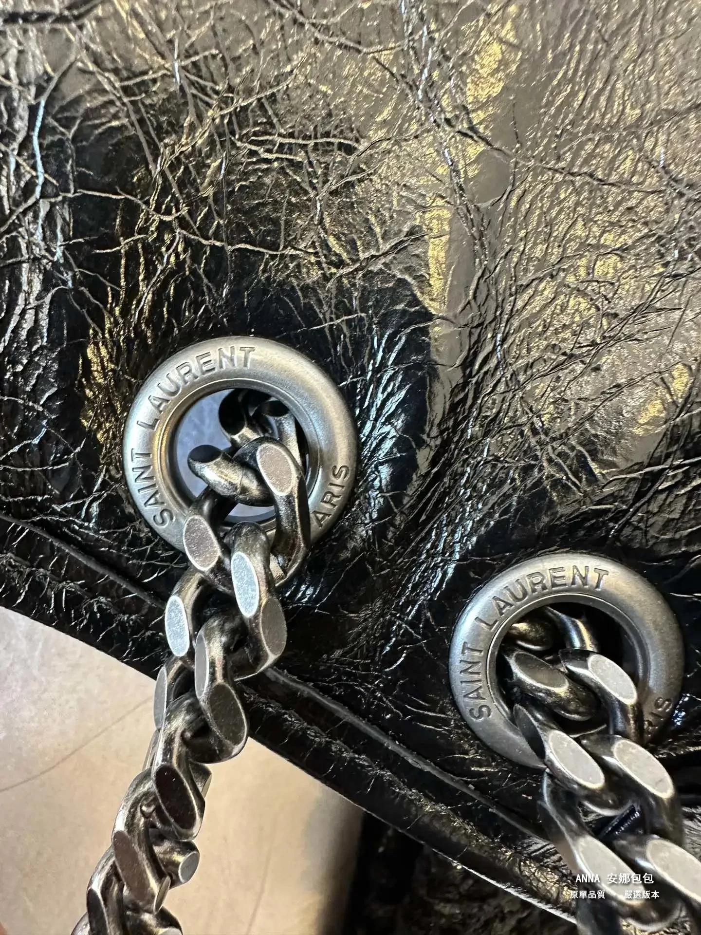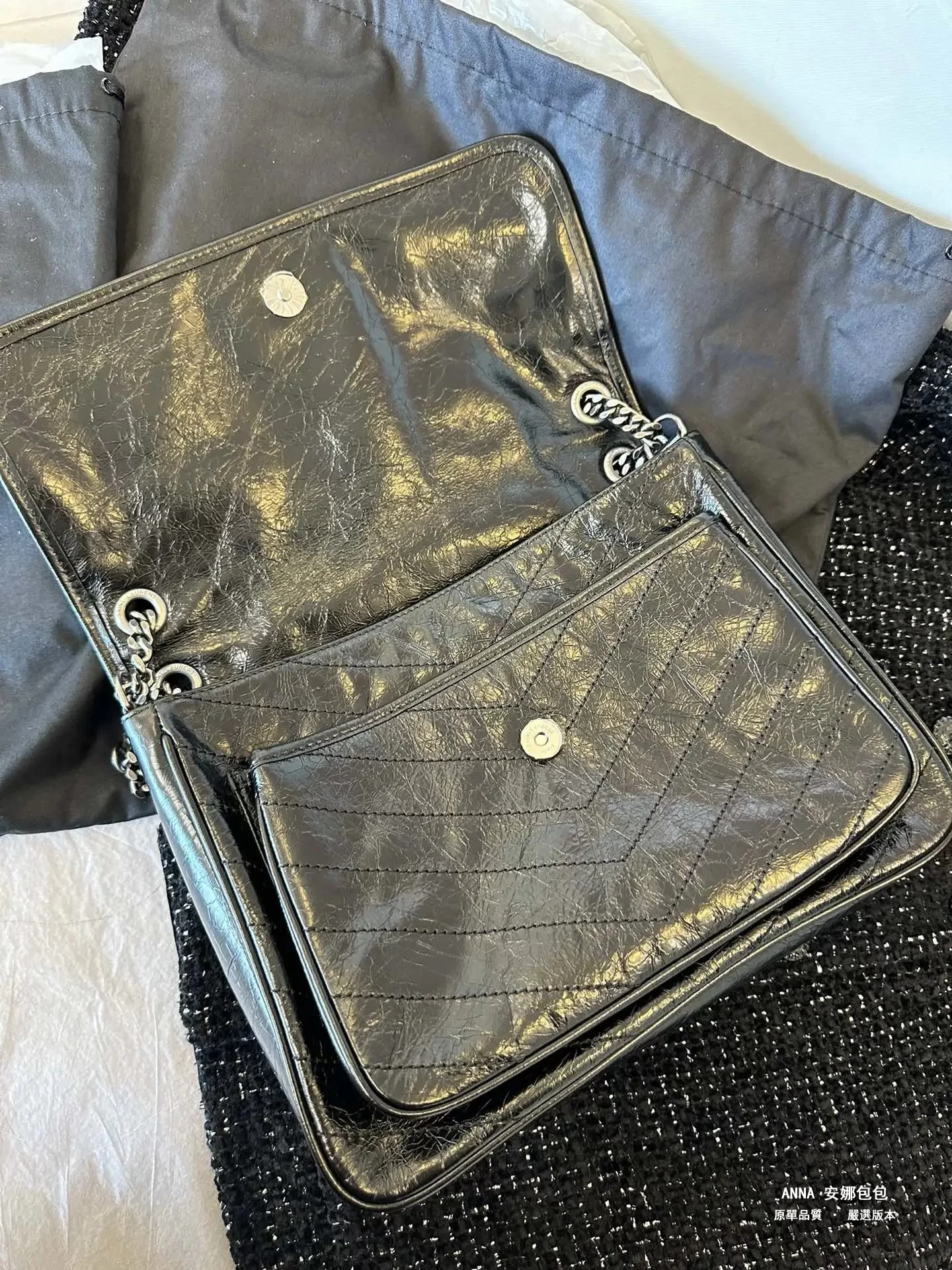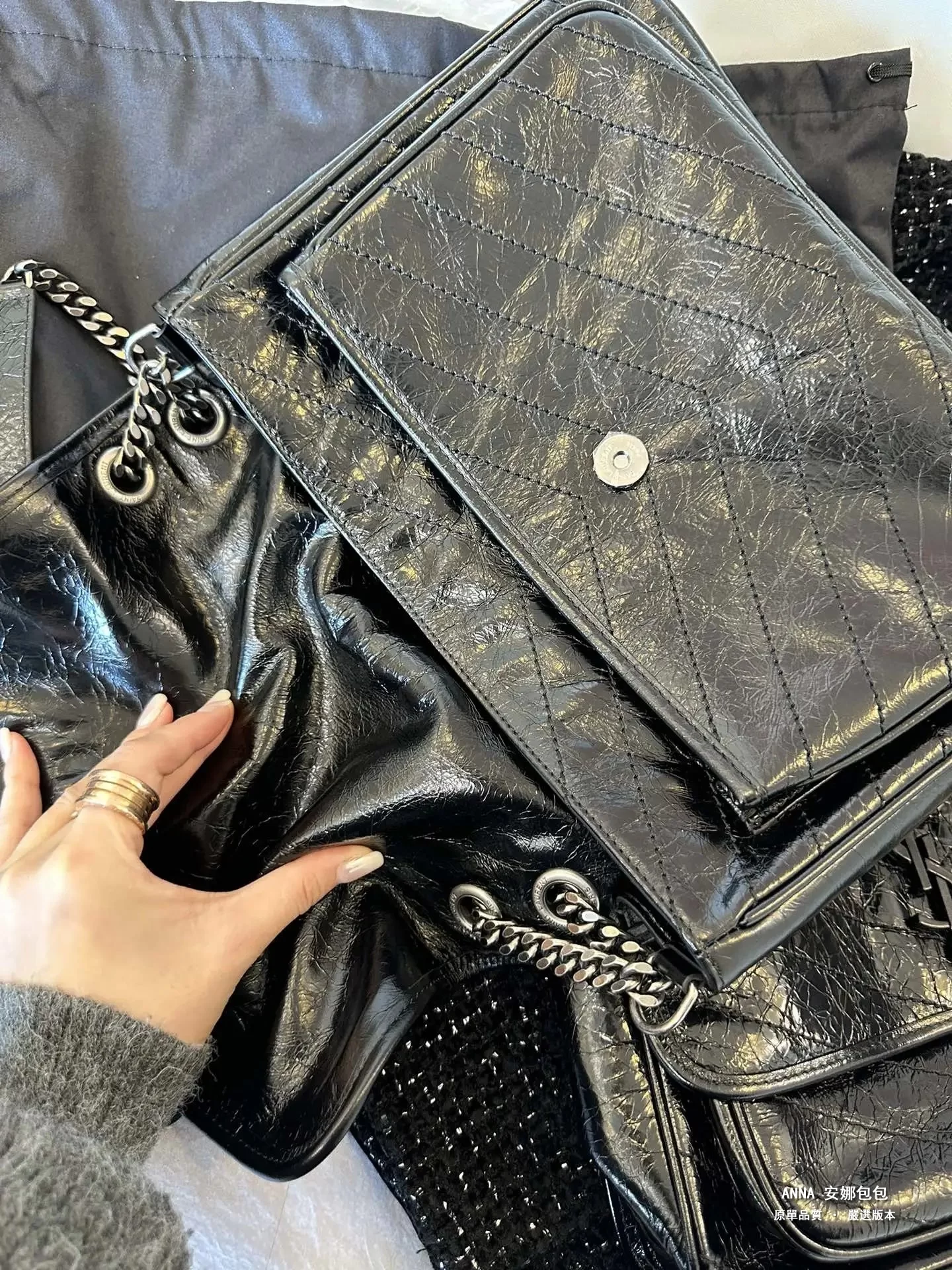 niki最大的亮點就是暴裂紋牛皮!褶皺暴裂感必需很強 黑色是最明顯的 原廠皮油油亮亮的效果,軟塌塌一種慵懶的感覺 ,摸起來不軟也不硬,表面看起來很油,光線足夠的情況下看起來不要太高級!這次的貨 很多輔料都是半成品裁片回國 肉眼可見的光澤度 油臘性足!牛逼到不行,哈哈哈真的很好很好很好;每個防僞細節都值得一看‼️雌吸扣,主要看字體,這個釦子不是銀色啊,是烏色的。完全可以拿去當原單正品出售,這個款真的是長期缺貨的狀態;聽說代購拿出去都是一萬五千多去賣,啊啊啊啊啊啊咱們價格實在划算啊。皮質不用說;真的是耐造的;反正這個包;你換個地兒都是3000往上的價拿到;你們未來可以看看;去專櫃,櫃姐也很難分得出來!就這麼牛逼!