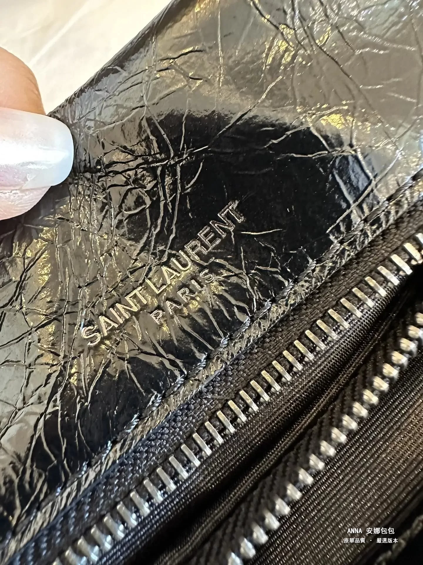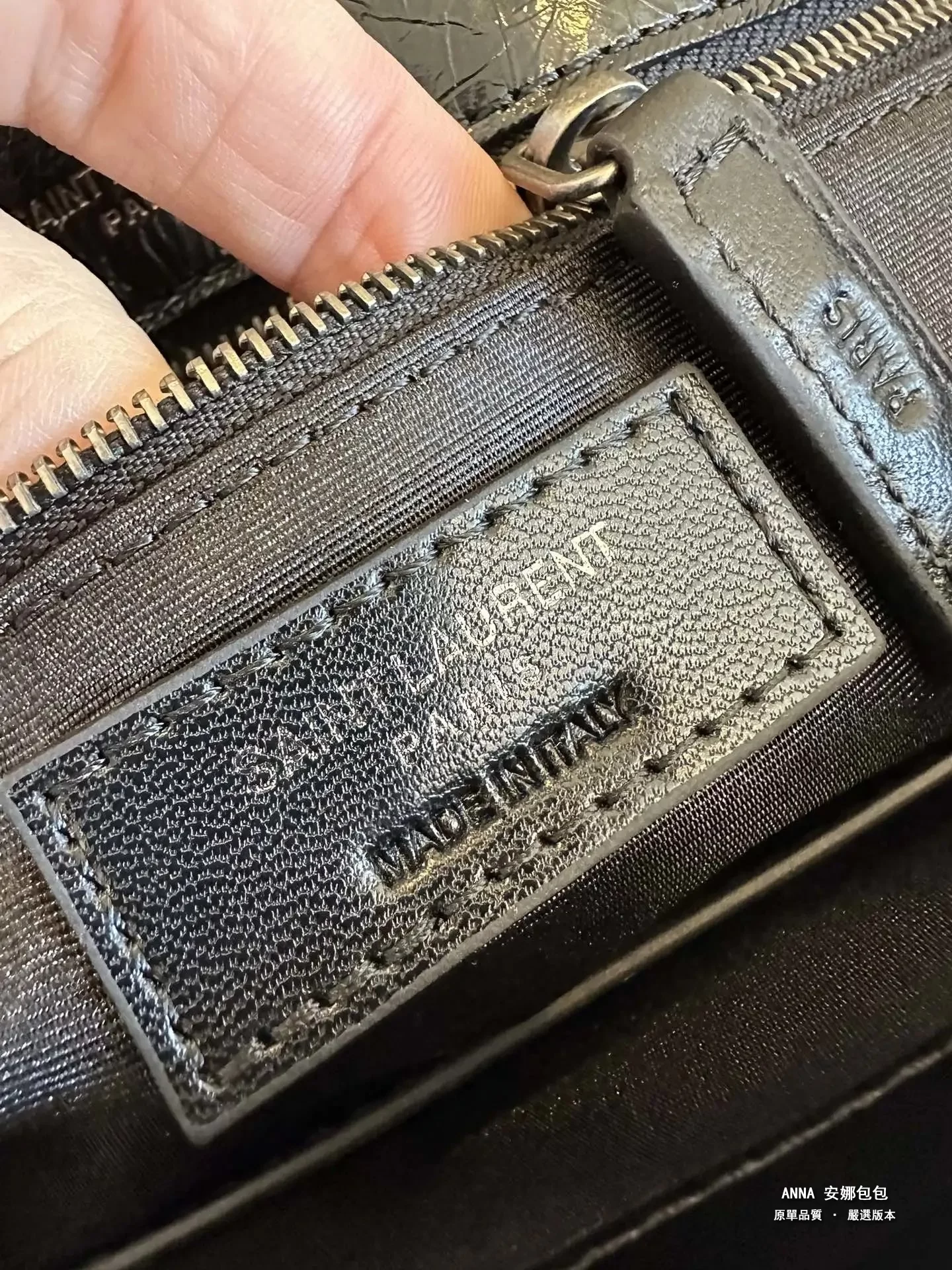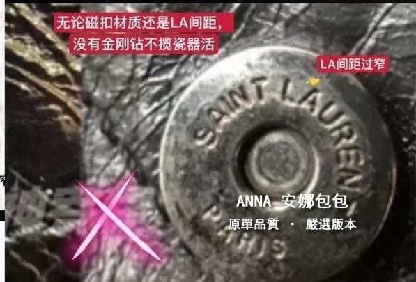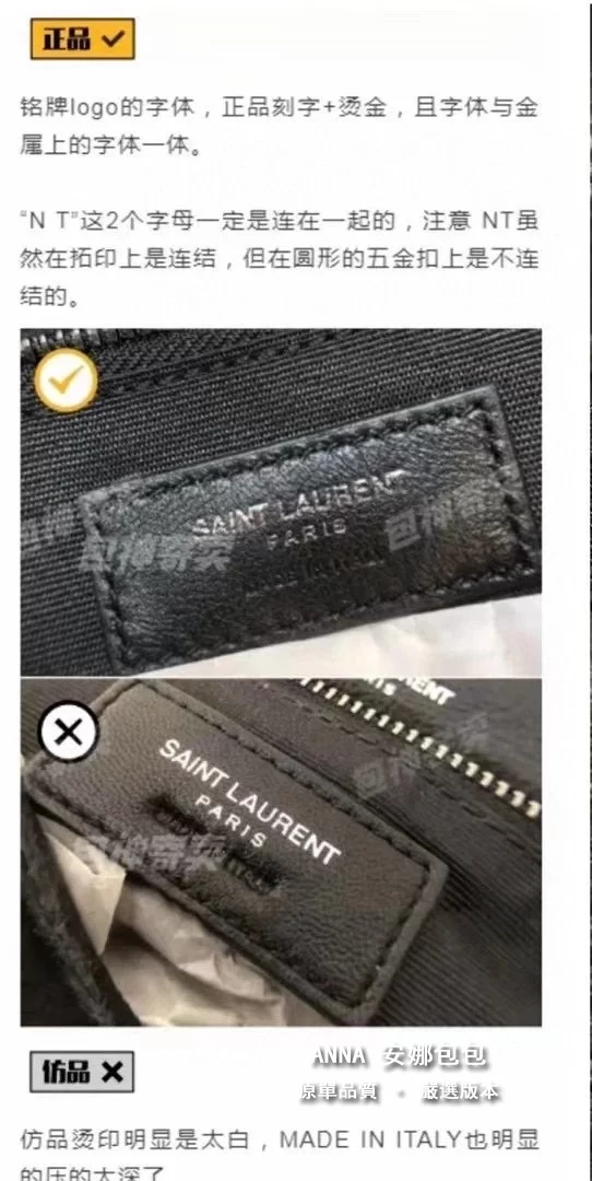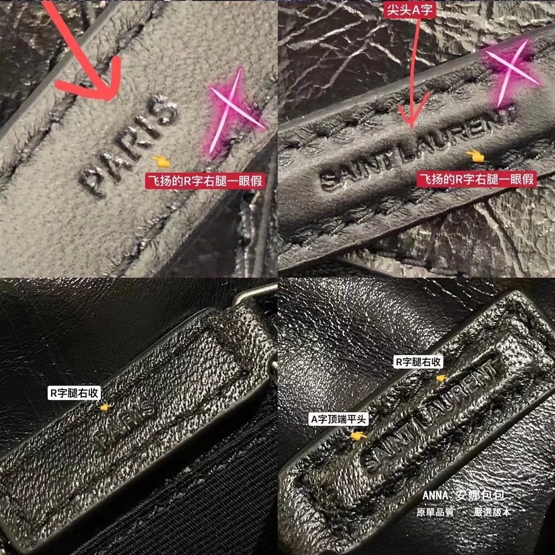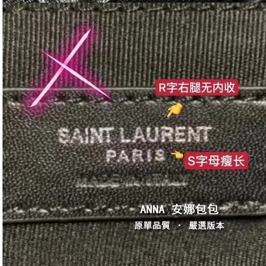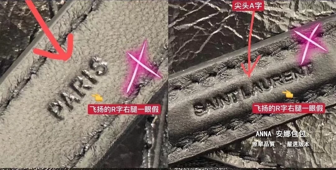 拉鍊頭;看似小小的拉鍊手柄,卻是隱藏衆多防僞點。。。拉鍊手柄一側的PARIS中的“R”字,一定是右腿內收;拉鍊手柄另一側的 SAINT LAURENT中的“A”字,頂端以頂是平的,不是尖角;“R”字,一定是右腿內收;每個字母都粗細均等,字體鏗鏘有力。