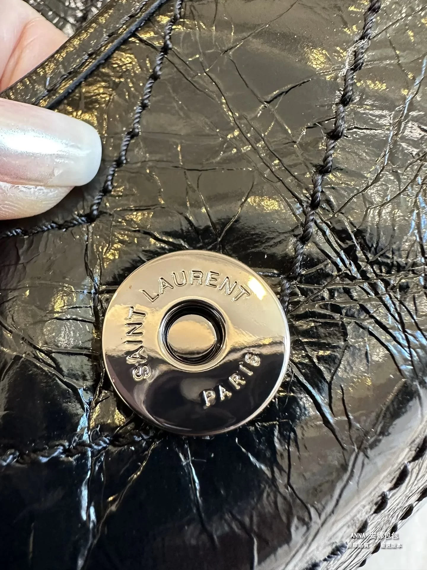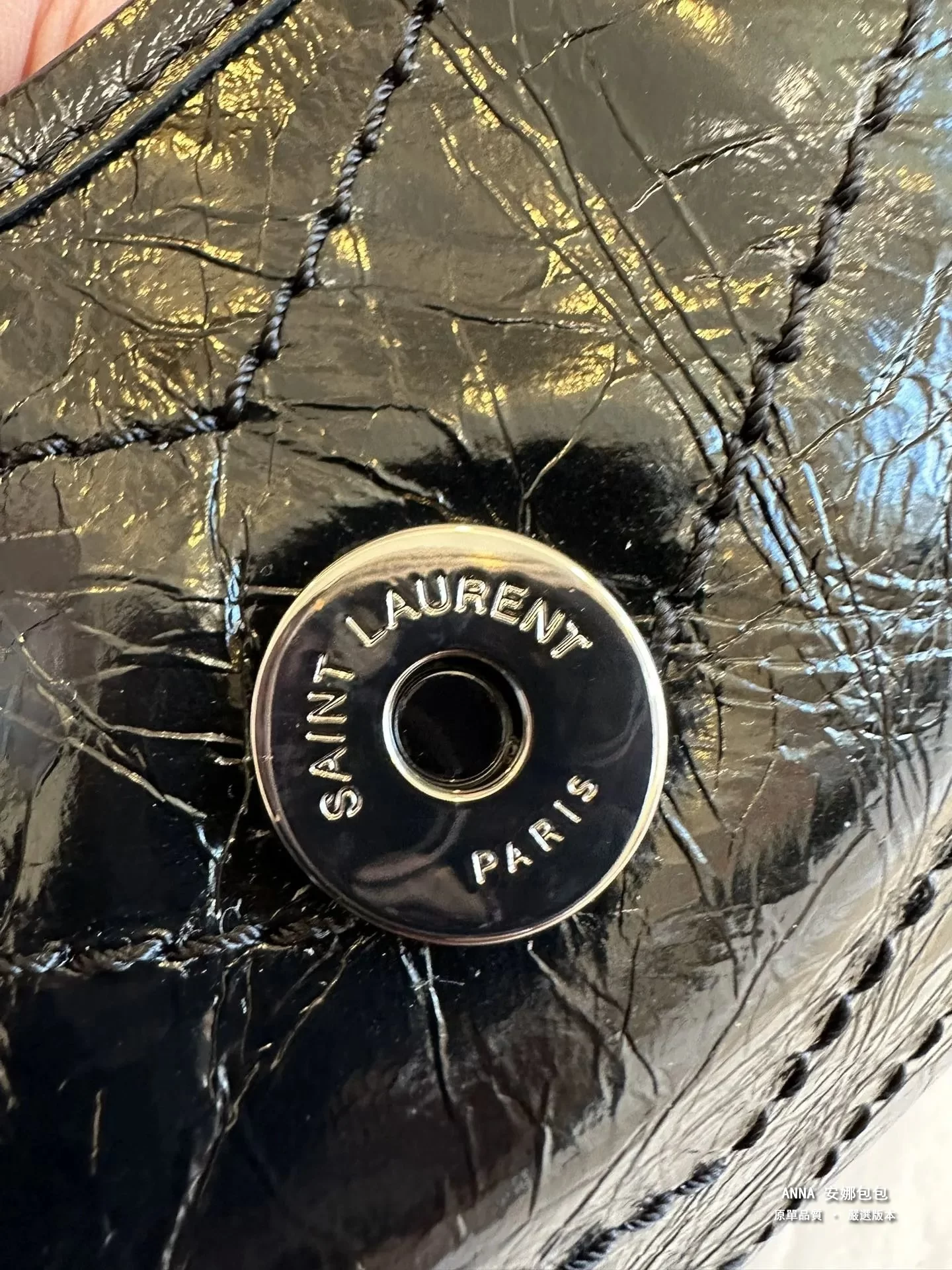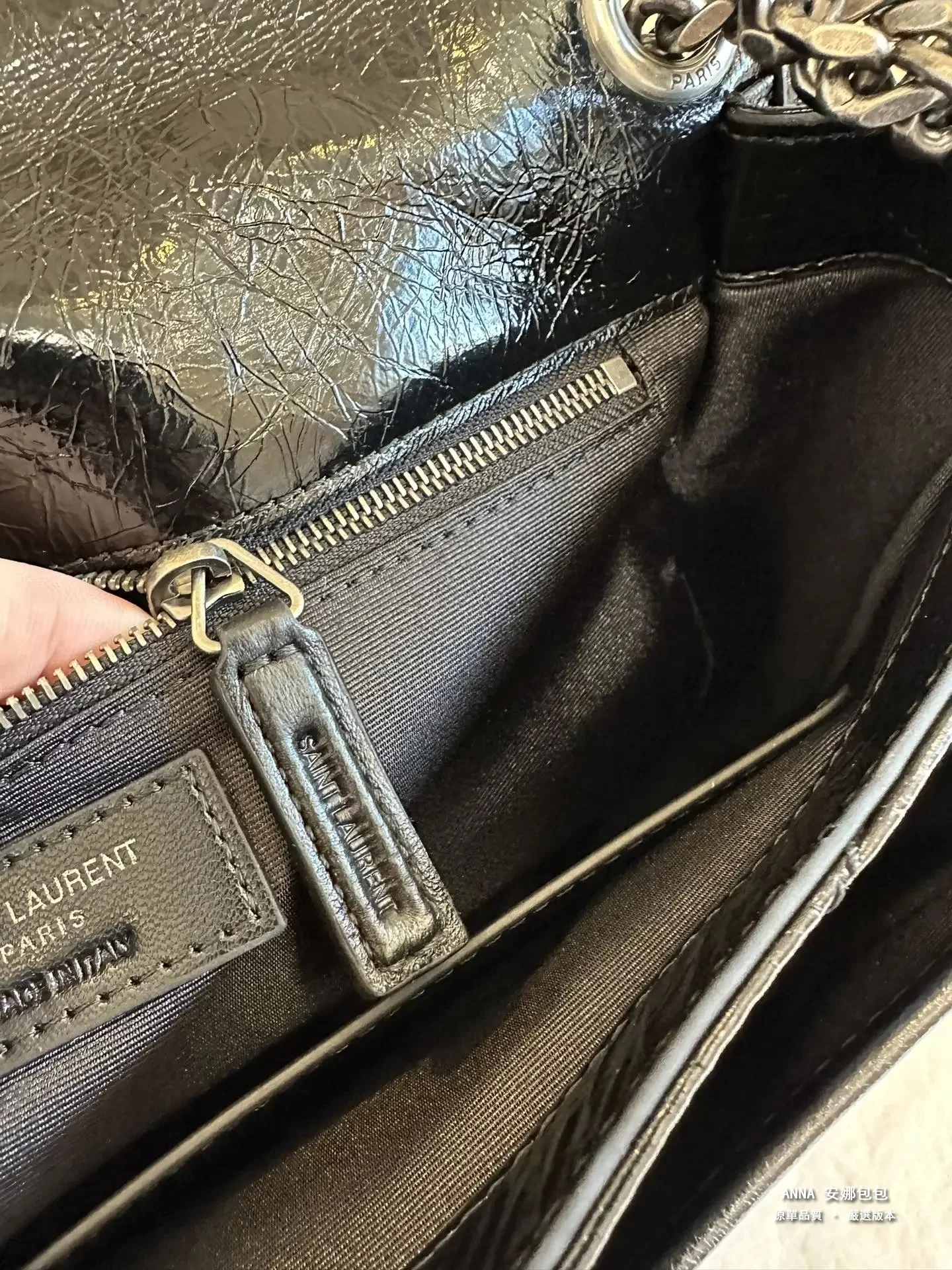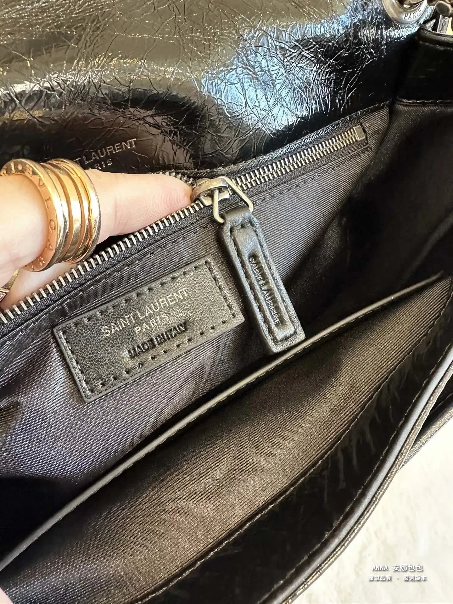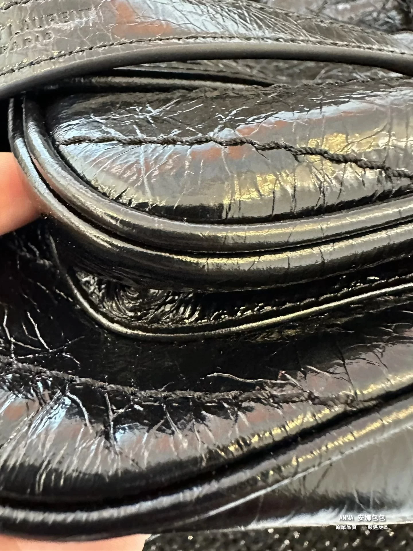 拉鍊頭;看似小小的拉鍊手柄,卻是隱藏衆多防僞點。。。拉鍊手柄一側的PARIS中的“R”字,一定是右腿內收;拉鍊手柄另一側的 SAINT LAURENT中的“A”字,頂端以頂是平的,不是尖角;“R”字,一定是右腿內收;每個字母都粗細均等,字體鏗鏘有力。